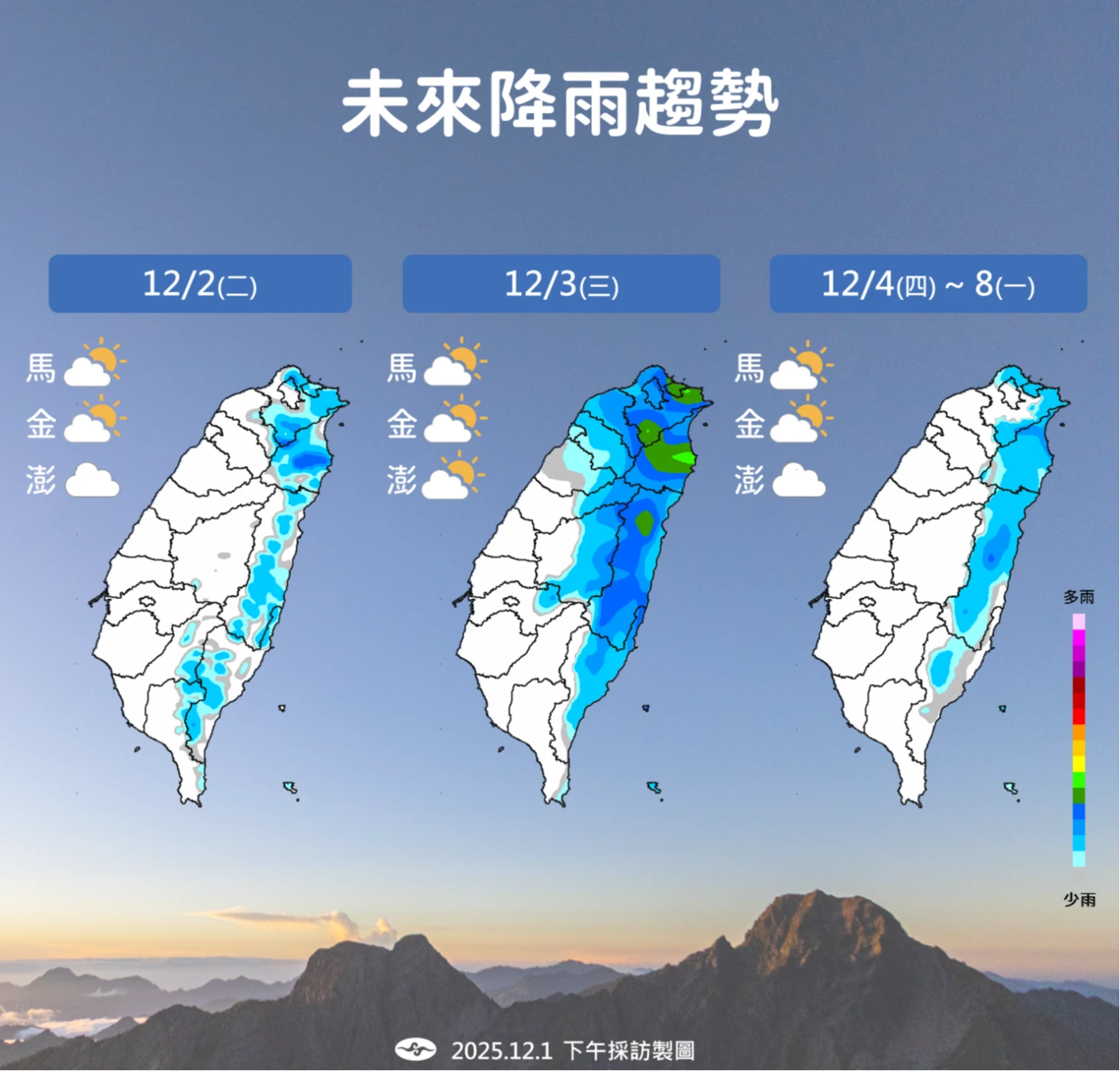這波降雨集中於北部、東部與中部山區及恆春半島,其中基隆北海岸、大台北及宜蘭更可能出現較大雨勢。若溫度及水氣條件配合,中部以北海拔3500公尺以上高山不排除出現零星降雪。