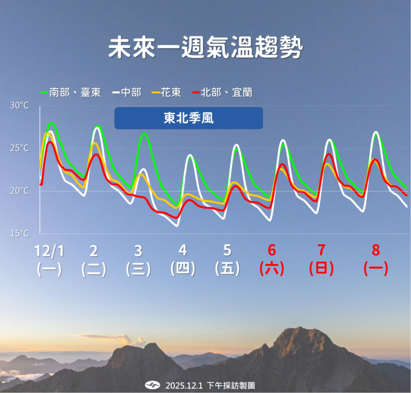 周四至周五(4日至5日)東北季風仍持續影響,北部、宜花維持濕涼,其他地區早晚偏冷;周六至下周一(6日至8日)東北季風減弱,氣溫逐步回升,但清晨與夜間仍具涼意。周四起至下周一水氣略減,降雨範圍縮小、僅基隆北海岸、大台北山區、東半部及恆春半島有局部短暫雨,其餘多為多雲到晴的天氣。