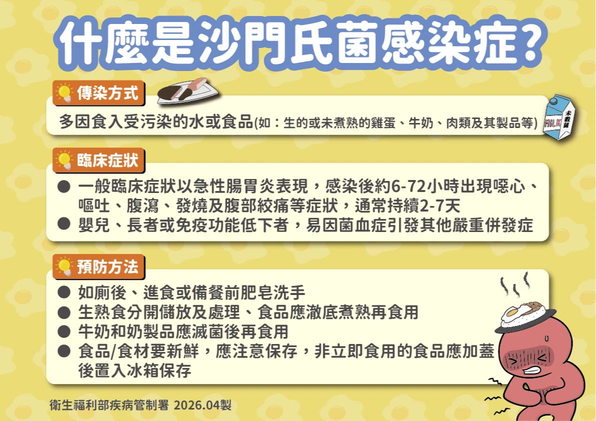曾淑慧指出,感染沙門氏菌的個案,多因食入受污染的水或食品,如生的或未煮熟的雞蛋、牛奶、肉類及其製品等,一般臨床症狀以急性腸胃炎表現,感染後約6-72小時出現噁心、嘔吐、腹瀉、發燒及腹部絞痛等症狀,通常持續2-7天,嬰兒、長者或免疫功能低下者,易因菌血症引發其他嚴重併發症。