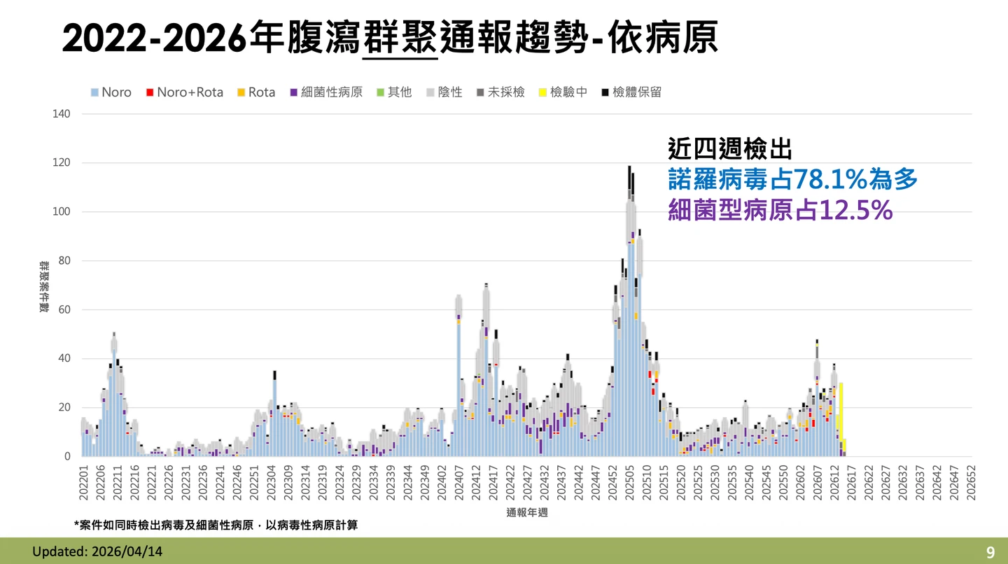 疾管署今(14)日下午舉行例行疫情周報記者會,發言人曾淑慧說,近期氣溫溫暖濕熱,細菌可以快速滋長、繁殖,比較容易造成腸胃道感染,近期兩個重要的腹瀉群聚事件,都是沙門氏菌感染所致,這個病菌的潛伏期短,最短只有6小時。