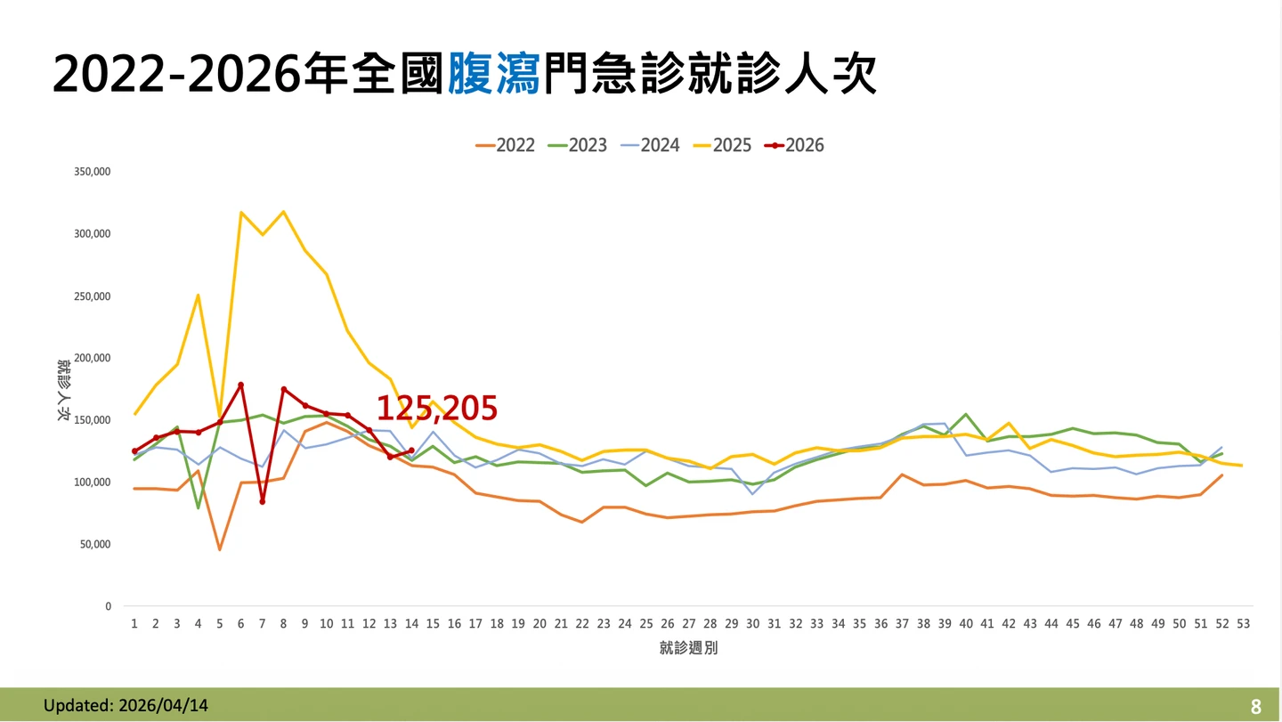 疾管署疫情中心主任郭宏偉表示,腹瀉疫情常在連假後上升,預計上收1至2周後會持續往下,不過未來一周仍需留意。4月5日至4月11日腹瀉門急診就診12萬5205人次,較前一周的11萬9787人次上升。