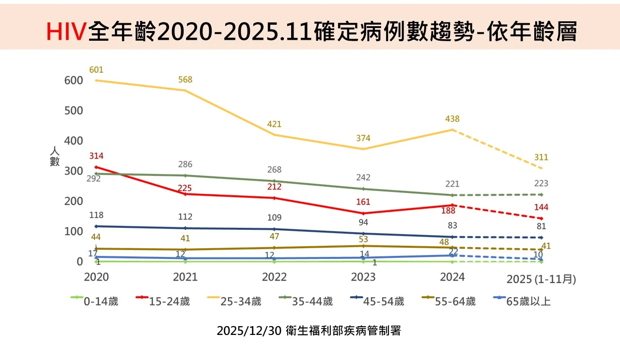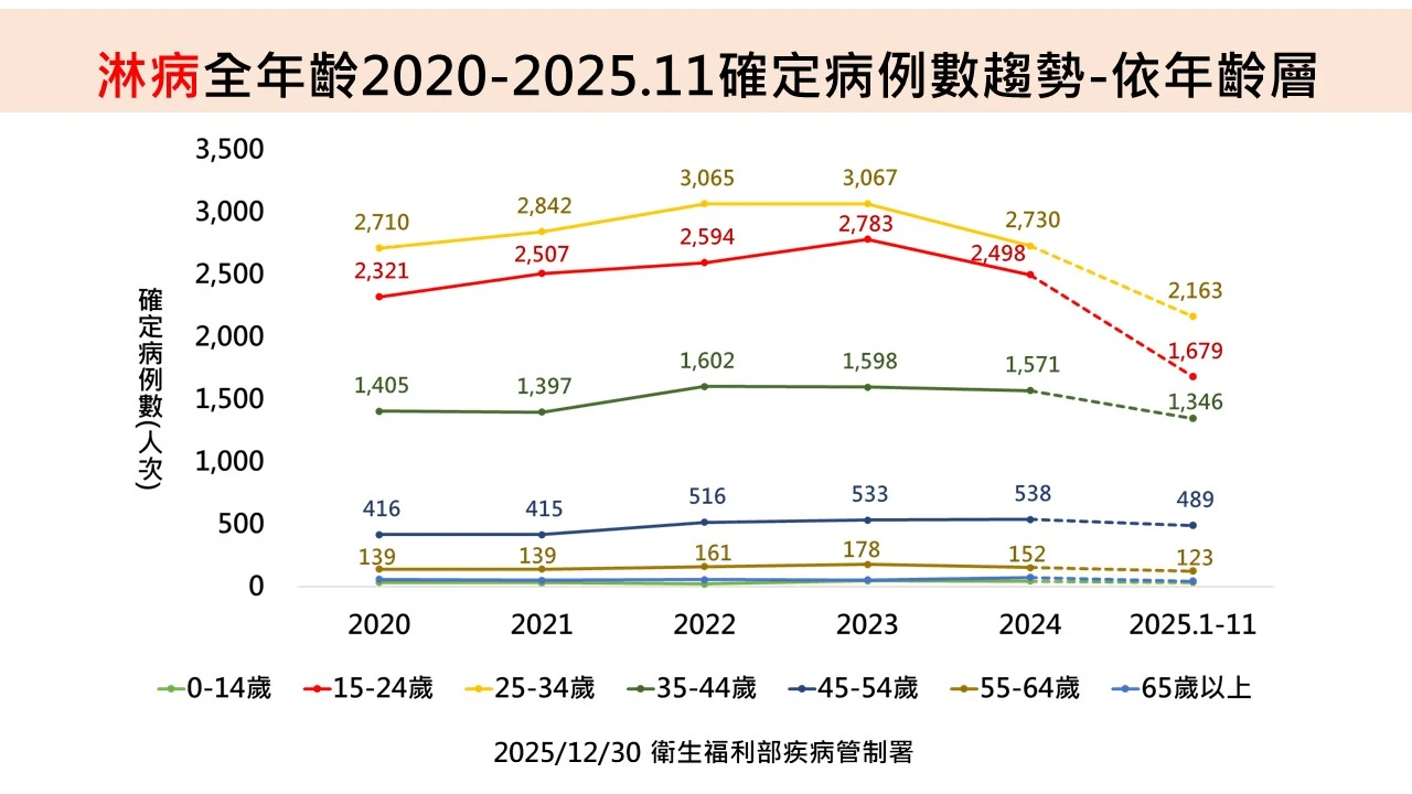 疾管署副組長詹珮君指出,截至11月30日全國性傳染病病例數,新增愛滋病毒感染810例、淋病5873例,皆較2024年同期的918例和7077例,分別下降12%與17%;而梅毒新增9072例,較去年同期的8894例略升2%。