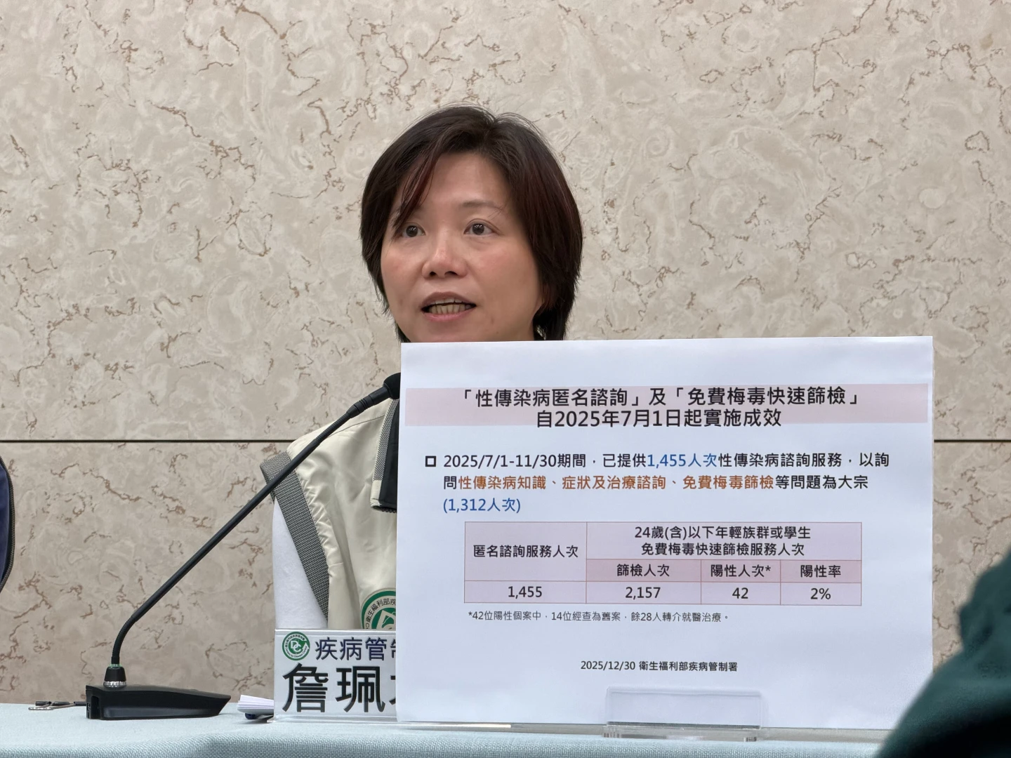 疾管署指出,今年7月至11月,匿名諮詢服務計提供1455人次,其中以詢問性傳染病相關問題,例如性病相關知識、篩檢、症狀或治療諮詢等最多;以及提供2157人次梅毒快篩服務,初篩陽性率約2%,陽性個案皆已完成轉介就醫治療。