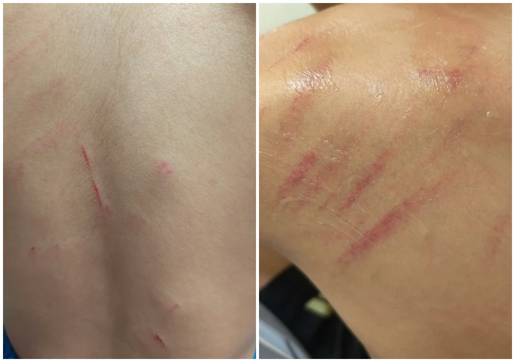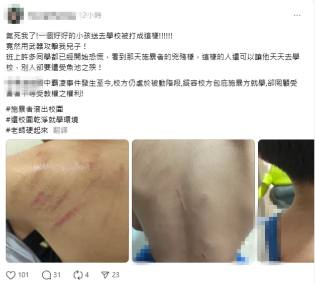 家長不滿校方縱容施暴方繼續就學,罔顧受害者平等受教權的權利,並貼出兒子傷勢照,清楚可見被害學生背部、後頸處有多處長條狀紅痕。
