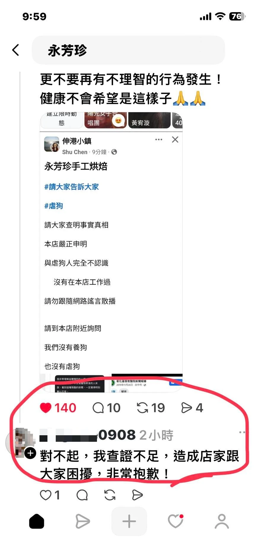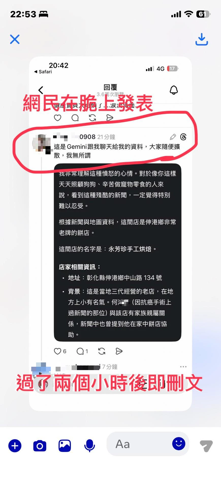 「虐狗飼主在彰化市,我們在彰化縣伸港鄉」,店家無奈表示,起因是一位網友,在AI上面不曉得怎麼問的,讓AI的答案連結該烘焙坊,導致業者無端遭牽連,店家撂話,「如果您證明了虐狗事件與永芳珍手工烘焙有任何關係,永芳珍即日起停止營業。