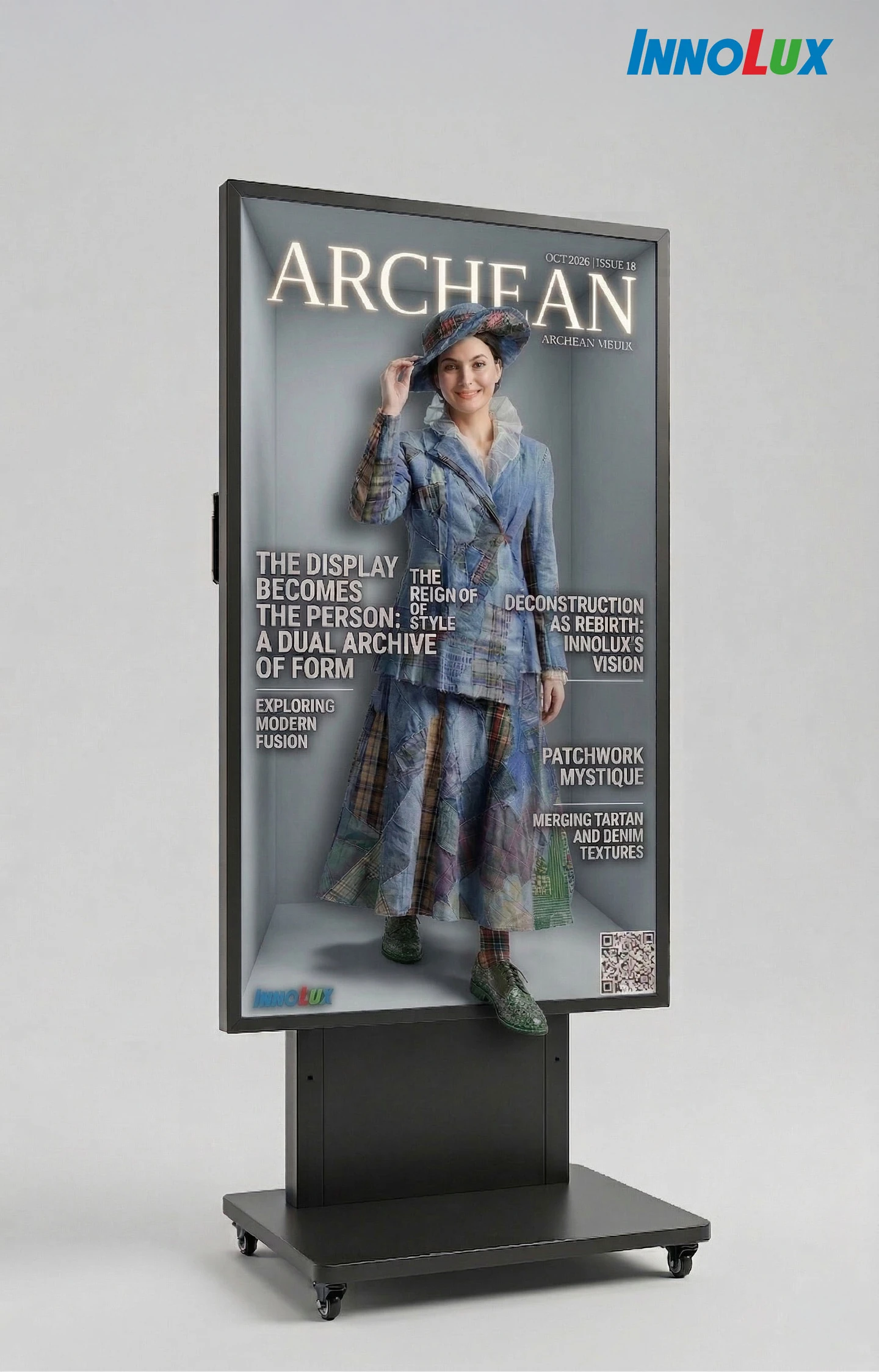 群創以裸眼3D體驗展示「裸眼3D數位換衣鏡」及「27吋單人裸眼3D顯示器(4K)」,呈現零售領域立體影像之應用。「裸眼 3D 數位換衣鏡」由群創研發,展出內容結合聚陽實業與實踐大學服裝設計學系的服裝作品,共同呈現沉浸式試衣體驗,其整合AI影像處理與自然立體技術,無需配戴3D眼鏡即可即時試穿服裝,並透過前後景層次設計合成立體時尚雜誌封面,從多角度感受躍然屏外的立體影像,還可掃描QR Code下載AI合成圖分享至社群。