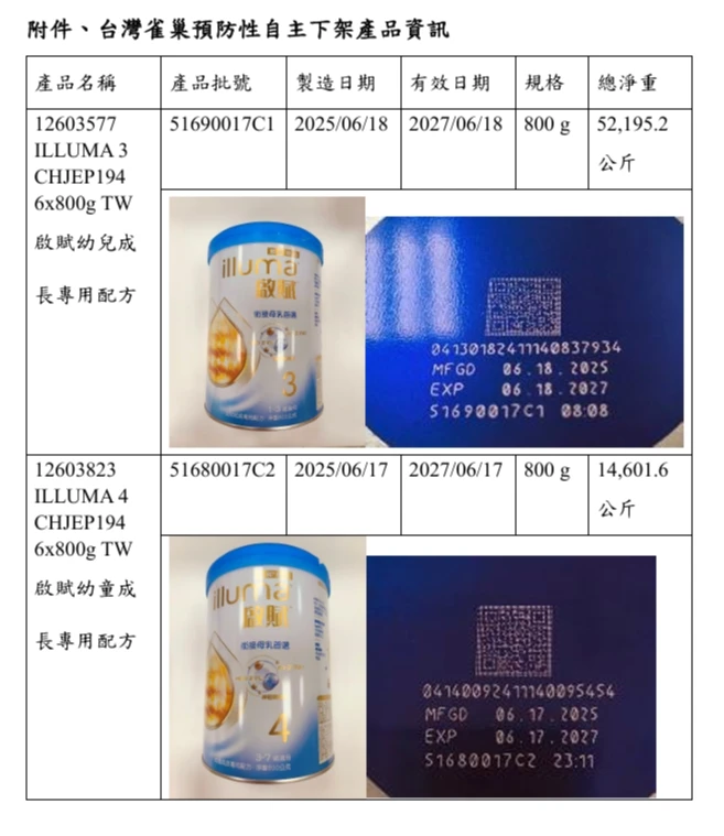 衛福部食藥署表示,今天接獲台灣雀巢公司自主通報,2批號「啟賦幼兒(童)成長專用配方」,分別是批號51690017C1、51680017C2,因無法排除使用到可能受源自仙人掌桿菌物質污染之原料,基於對消費者健康安全之高度重視,故啟動預防性自主下架,總共8萬3496罐。並提供退換貨處理專線︰0809-000-828。