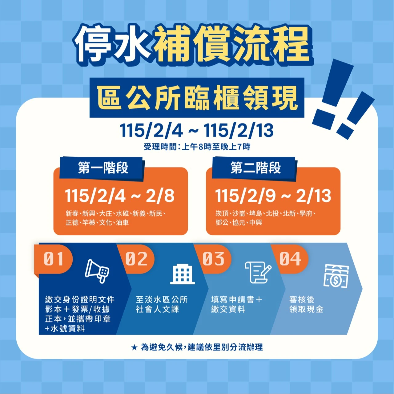 新工處說明,符合優先補償資格的民眾,請依申請地址所在里別,分別於2月4日至8日、2月9日至13日,每日上午8時至晚上7時,攜帶發票或收據、身分證影本、水號資料、印章等文件,至淡水區公所填寫申請書領取補償,或至淡北道路官網下載申請書,填寫後附上匯款帳戶影本,於2月13日前郵寄(郵戳為憑)至新北市政府新建工程處(地址:新北市樹林區樹新路40-7號6樓),匯款領取補償。