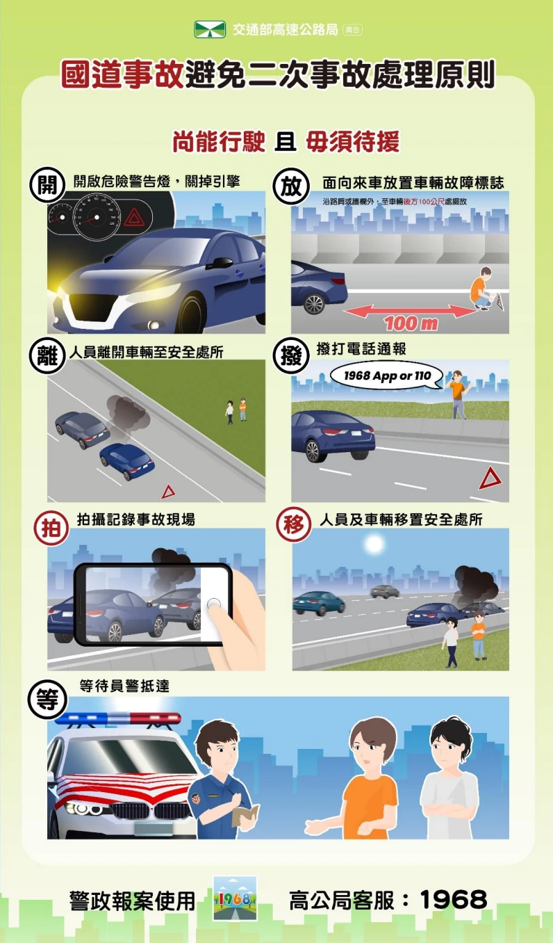 國道公路警察局表示,車輛於國道故障或發生事故時,若無人傷亡且車輛尚能行駛,請遵循「開、放、離、撥、拍、移、等」7步驟進行處理: