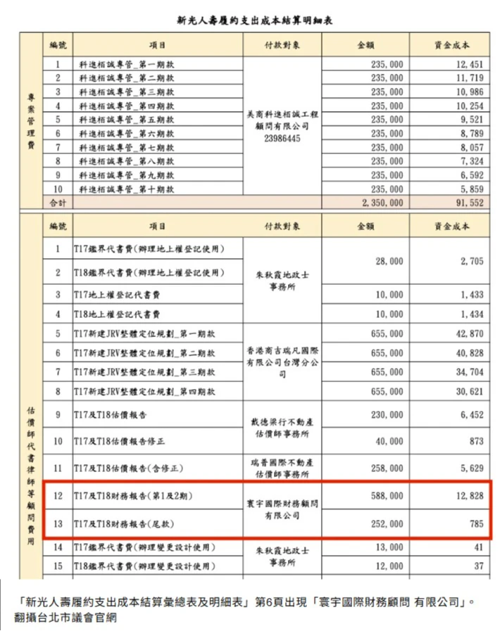 進一步追查台北市議會大會議決案目錄中,報告事項第140470號,「新光人壽履約支出成本結算彙總表及明細表」第6頁出現「寰宇國際財務顧問有限公司」,證實寰宇公司是曾受新壽委託的外部專業顧問,而8位北車商場甄審會出席委員名單,范雪梅現任寰宇國際財務顧問有限公司總經理。