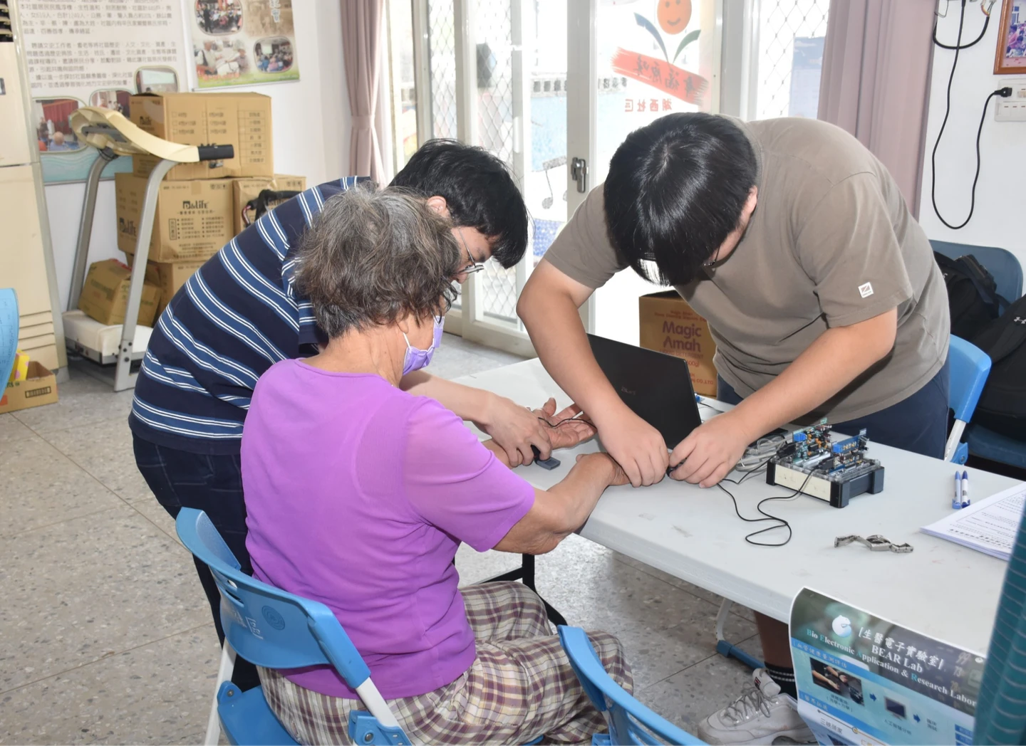 團隊導入長者輕度認知功能障礙(MCI)的評估警示模型,期盼能及早發現阿茲海默症與失智症等潛在風險。圖為團隊替長者進行心智與血管狀態評估。台科大提供 zoomin