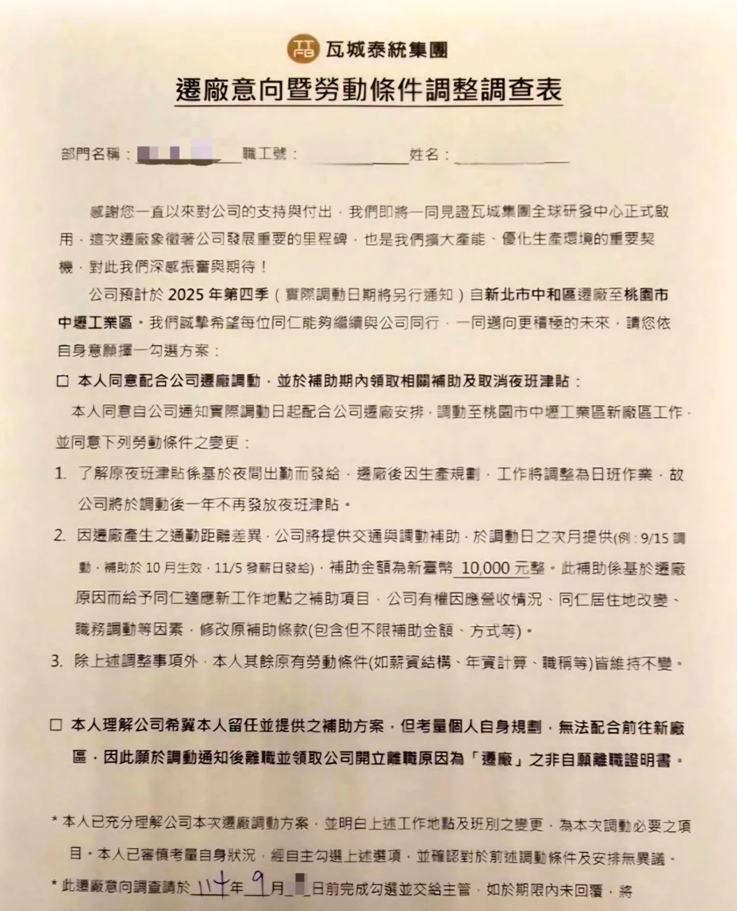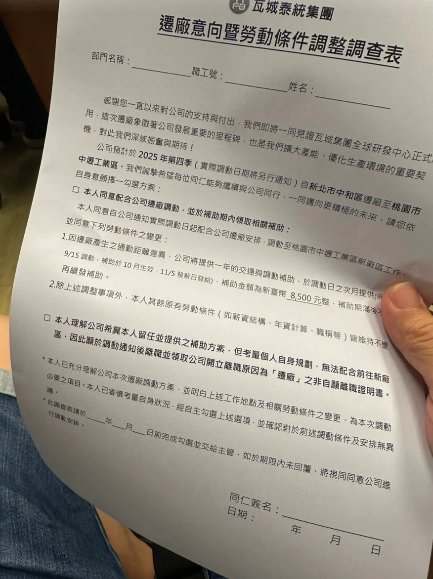 據了解,直到今年9月1日,瓦城泰統人資首次與員工協商,正式預告第四季將從新北市中和區遷廠到桃園市中壢工業區,同意調往中壢每月補助8500元,作為交通與調動補助,為期一年;不同意者即離職。