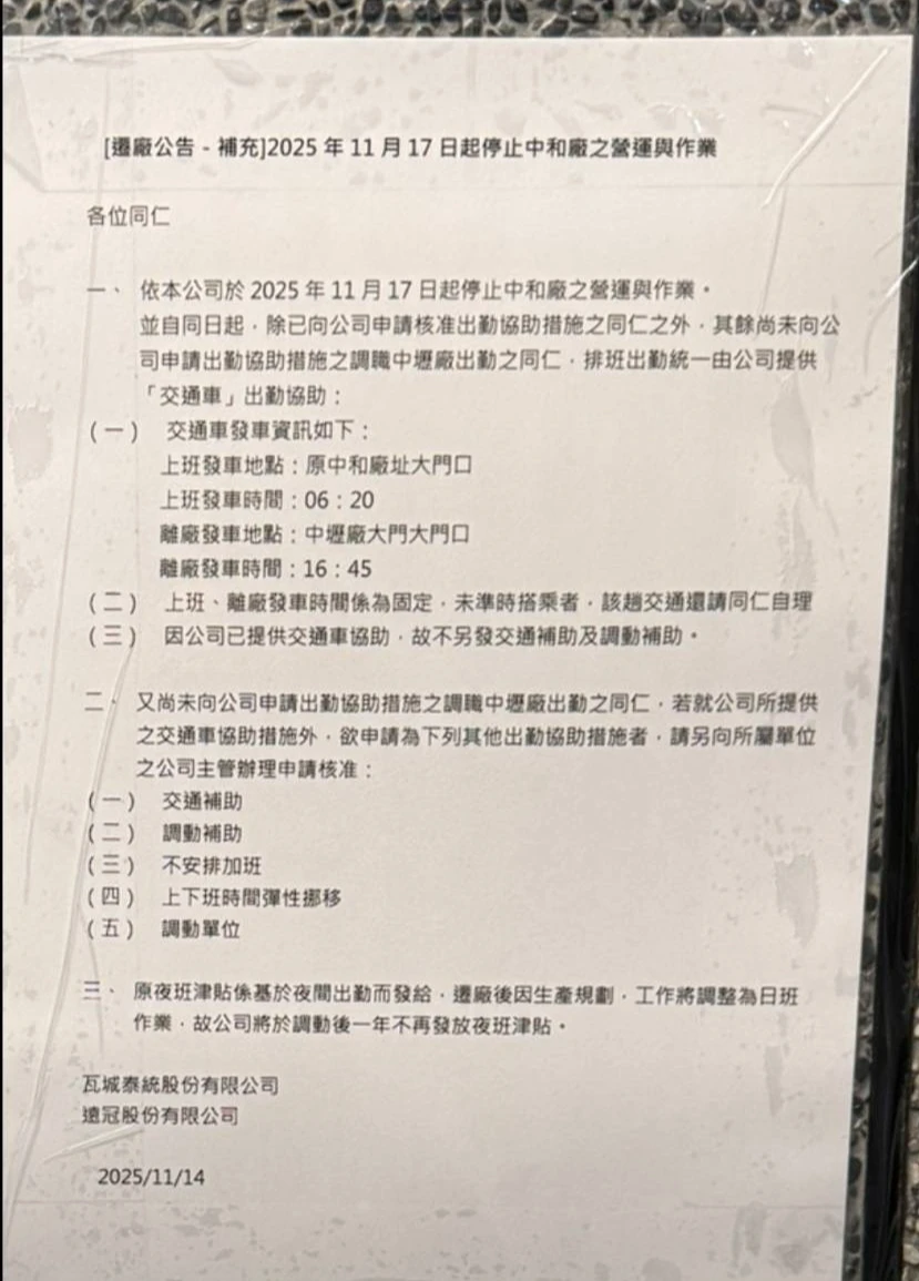 人資最後在本月12日公告,因為有無期限交通車及調動補助,已符合《勞基法》第10-1條調動基準,不同意者無法以資遣辦理,14日辦妥離職手續,瓦城泰統將提供非自願離職證明。未離職者依班表到中壢廠出勤;經主管核准可申請調動補助、交通補助等。