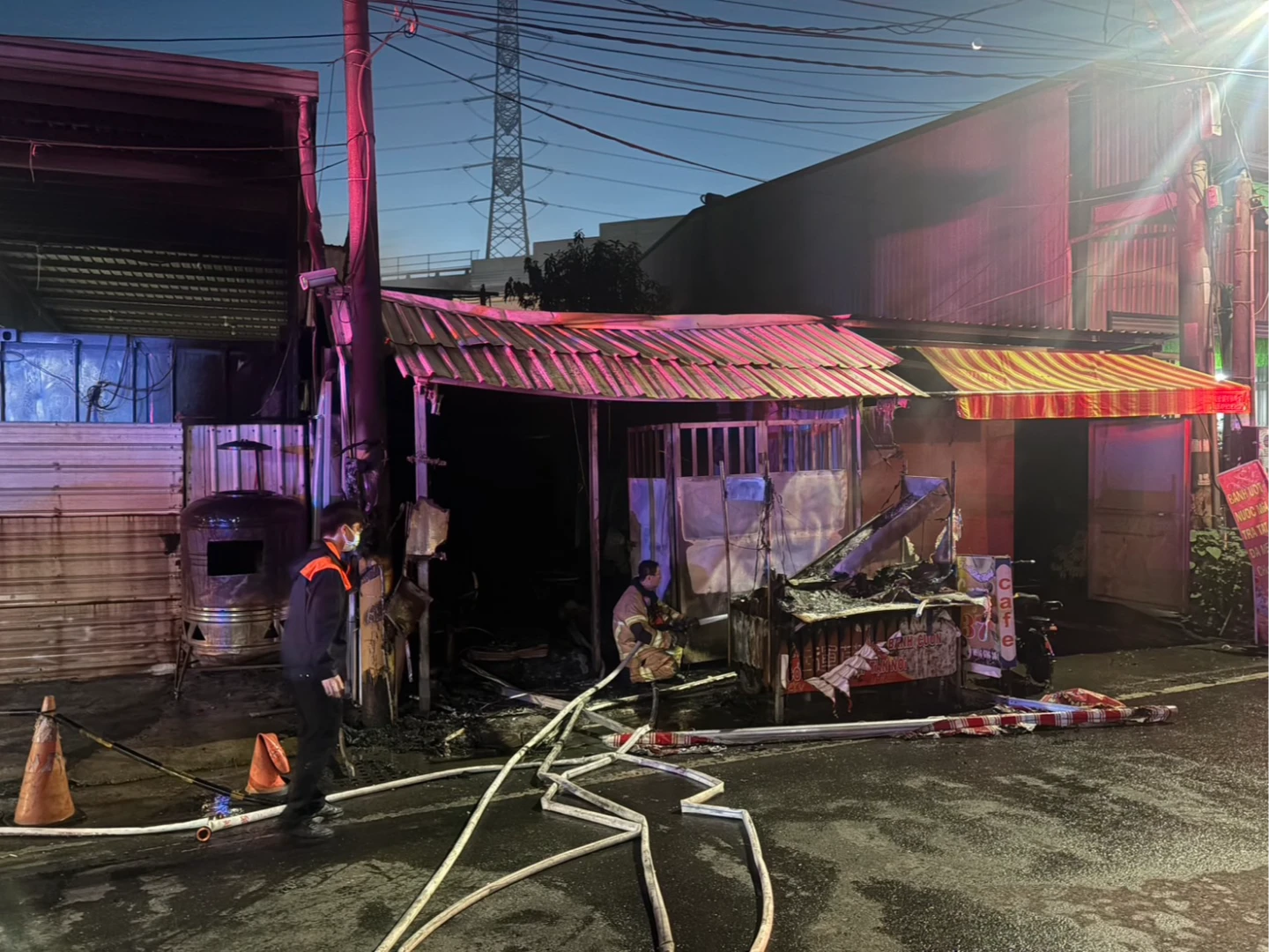 據了解,起火建物為一處鐵皮屋,該處由3名外籍移工分租居住,屋前騎樓平時設有販售越南腸粉的小吃攤,今天凌晨4時許突然竄出火煙,鄰居聞到燒焦味,外出查看後發現是火災,連忙報警。