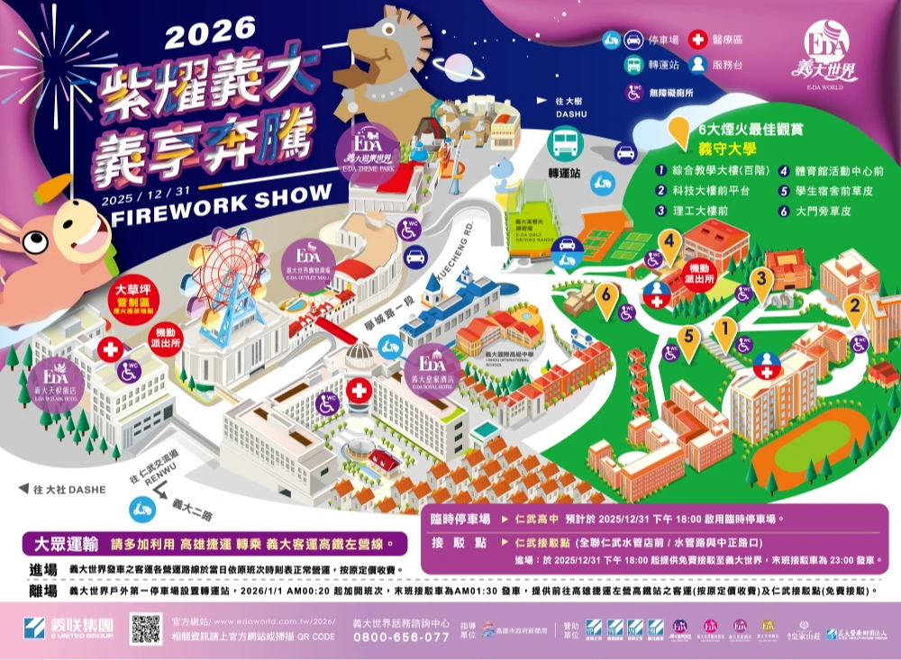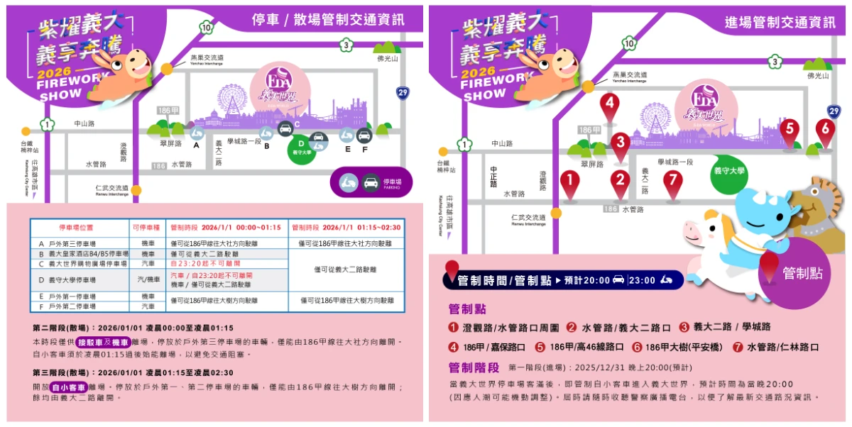 義大世界表示,跨年煙火每年吸引數萬人潮,今年規劃三階段交通管制,第一階段是進場管制,預計晚間8點起汽車進場管制、晚間11點起機車管制,管制時間會視義大世界的停車場狀況彈性調整。