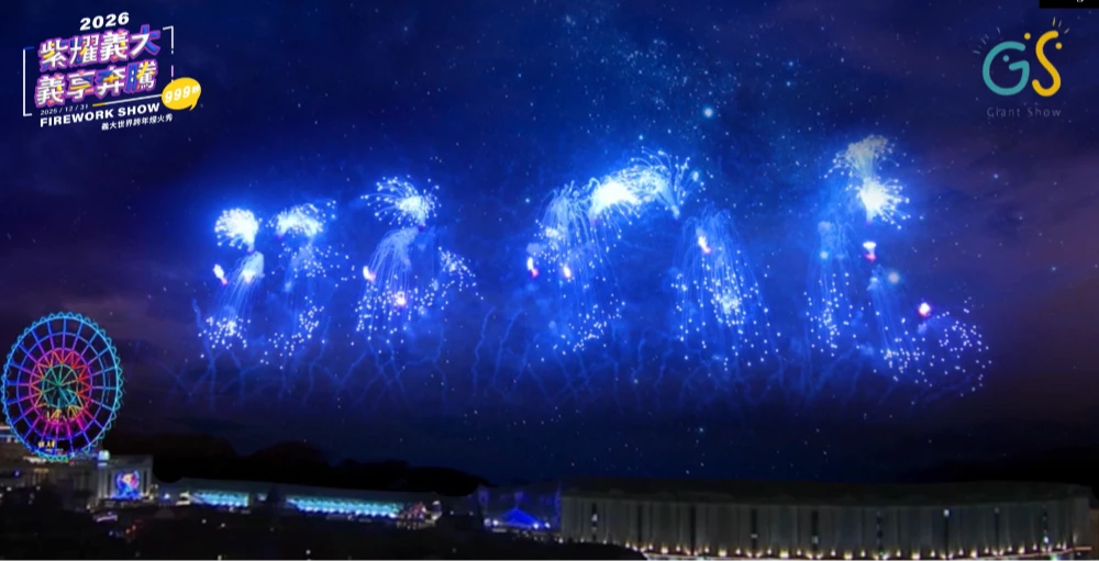 義大世界跨年煙火邁入第17年,今年同樣於購物廣場後方大草坪施放,999秒煙火分為六大篇章,並因應遼闊地形加碼高空煙火,確保全區視野。全台獨家的「藍色流星雨煙火」以罕見藍色煙火鋪陳夜空,遠看如藍寶石雨傾瀉、近看宛若宇宙星河,帶領觀眾沉浸在唯美科幻的藍色夢境。