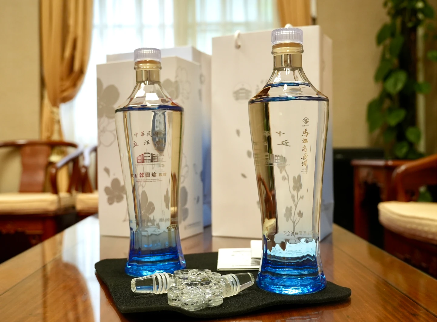 本次新款專供酒以晶透玻璃為器,瓶底引人目光的海洋蔚藍,取意馬祖每年春夏之際的夜海奇景「藍眼淚」。當海洋湛藍與島嶼流光交織,象徵時間、海洋與島嶼風土對酒液的長年涵養。瓶頭整體設計則以我國國花—梅花為造型,其中的晶透流沙隨著角度緩緩流動,更顯雅致脫俗。瓶身整體設計莊重內斂,兼具文化意涵與典藏價值。如透過燈光映照與流動,瓶身彷彿映照出馬祖海域的粼粼波光,閃耀出海島台灣乘風破浪的希望。