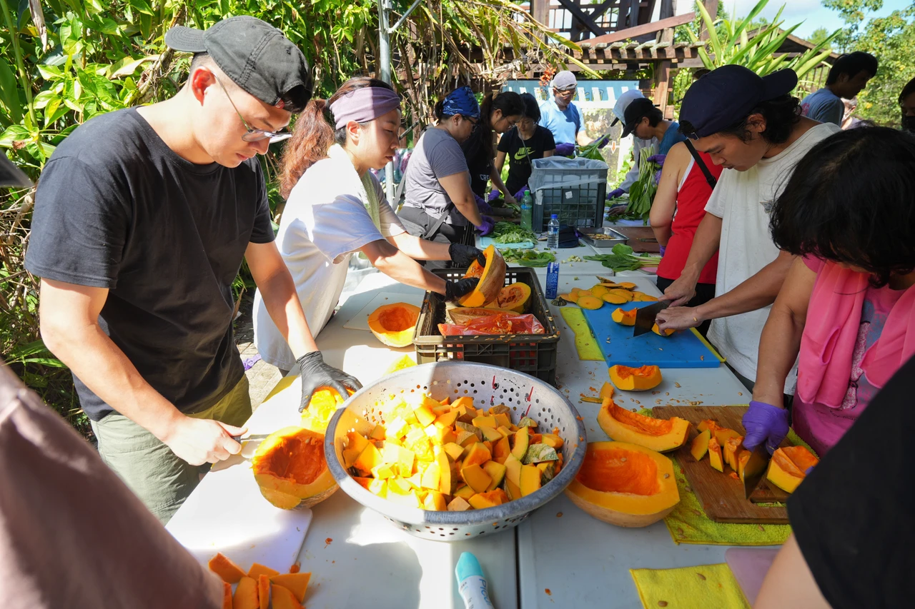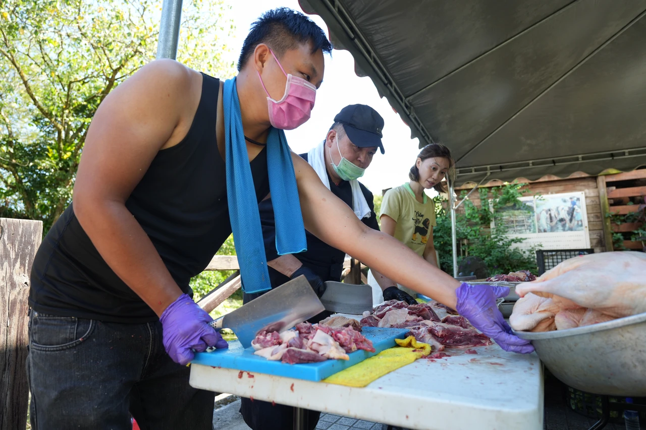 採訪這天走進欣綠農園,遠遠就聞到麻油雞的香味,現場50人左右的義煮團,有人拿著菜刀不斷切菜,有人持著鍋鏟不斷翻動麻油雞,更有人已將便當盒擺放整齊,等待菜餚烹煮完畢進行分菜。只見一名身材魁武的男子不斷內外穿梭,指揮現場50人進行義煮,此人正是義煮團召集人、也是台灣國際年輕廚師協會副理事長王聖翔。