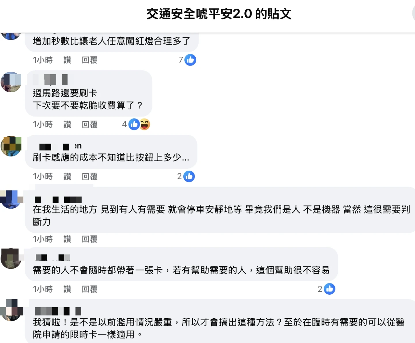 但也有人意見相左。臉書粉專「交通安全唬平安2.0」發文指出,在挪威,只是在交通號誌桿設定一個按鈕,供那些通常需要更多時間的人使用。新竹市府的「敬老愛心號誌」設計,透過敬老愛心卡來篩選「不符資格卻有需求『延長秒數』」的群體,卻讓「臨時」受傷或身體不舒服的人、無法拿到敬老愛心卡的人被排除在外,這違反了交通公平理念,「按鈕似乎比需要一張卡更明智」。