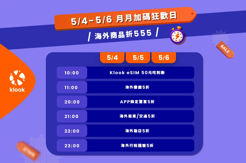 海外商品95折最高折555元,與海外飯店、租車與體驗行程5折等限量優惠也輪番上陣開搶。Klook表示,「月月加碼狂歡日」未來將於每月固定推出,預計一路延續至年底。