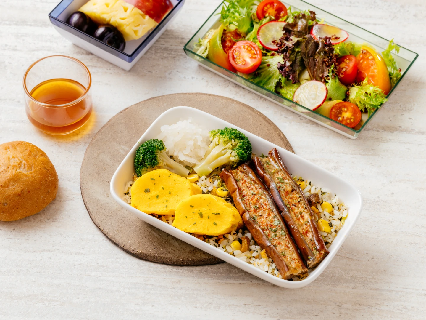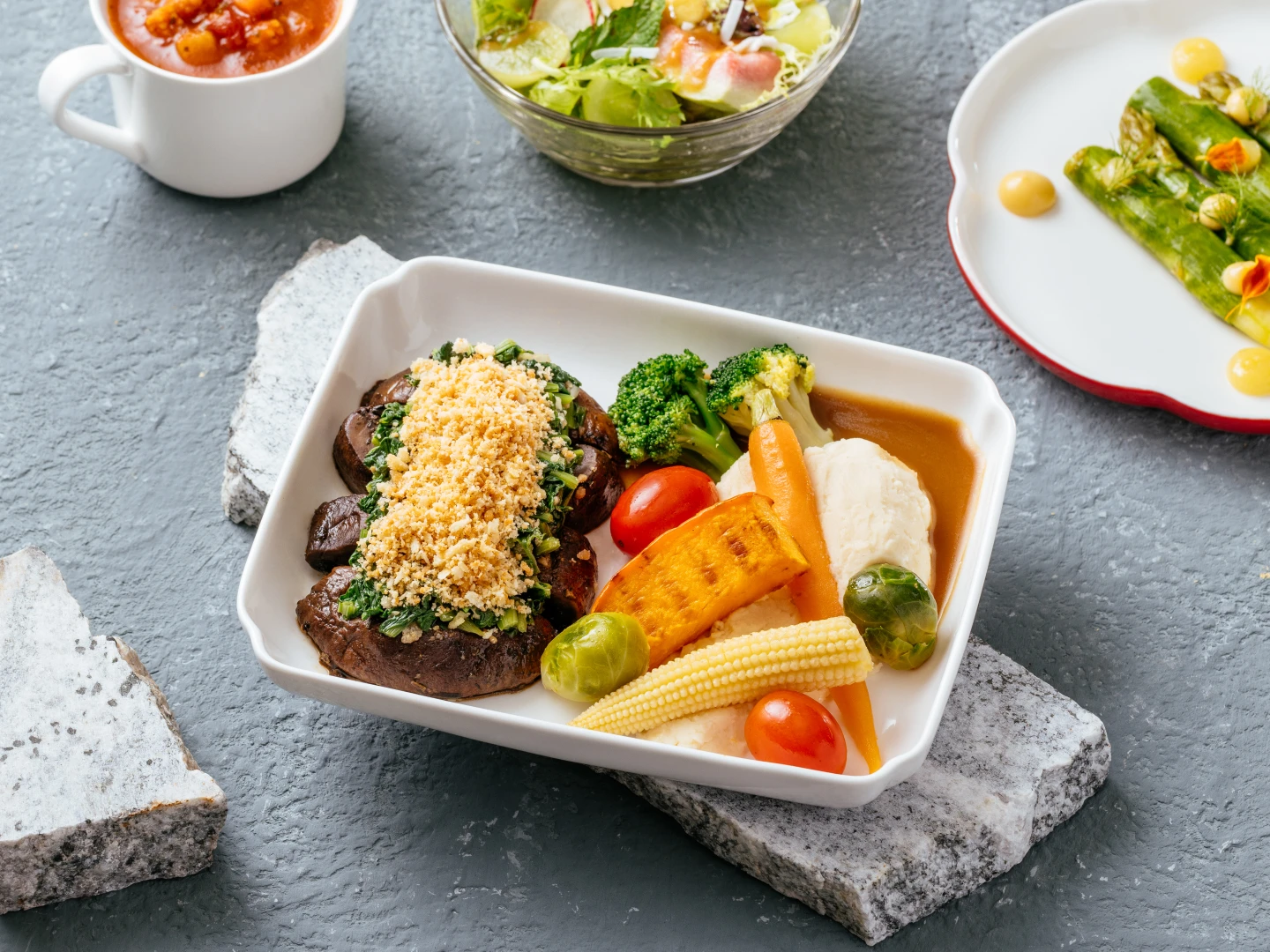 同時,華航於桃園出發之全航線各艙等推出專屬西式蛋奶素特別餐,每一道皆為精心打造的蔬食料理。豪華商務艙/商務艙餐點由前菜「蘆筍佐椰香柳橙醬」開場,蔬菜鮮脆帶有酸甜果香;「芭樂沙拉佐梅香醋醬」帶來清新口感;湯品為溫潤濃郁的「番茄蔬菜羅宋湯」,主菜由「洛克菲勒波特菇排與黑糖烘米醬」招牌料理壓軸上場,菌菇的多汁與黑糖醬香交織出濃郁新食感。