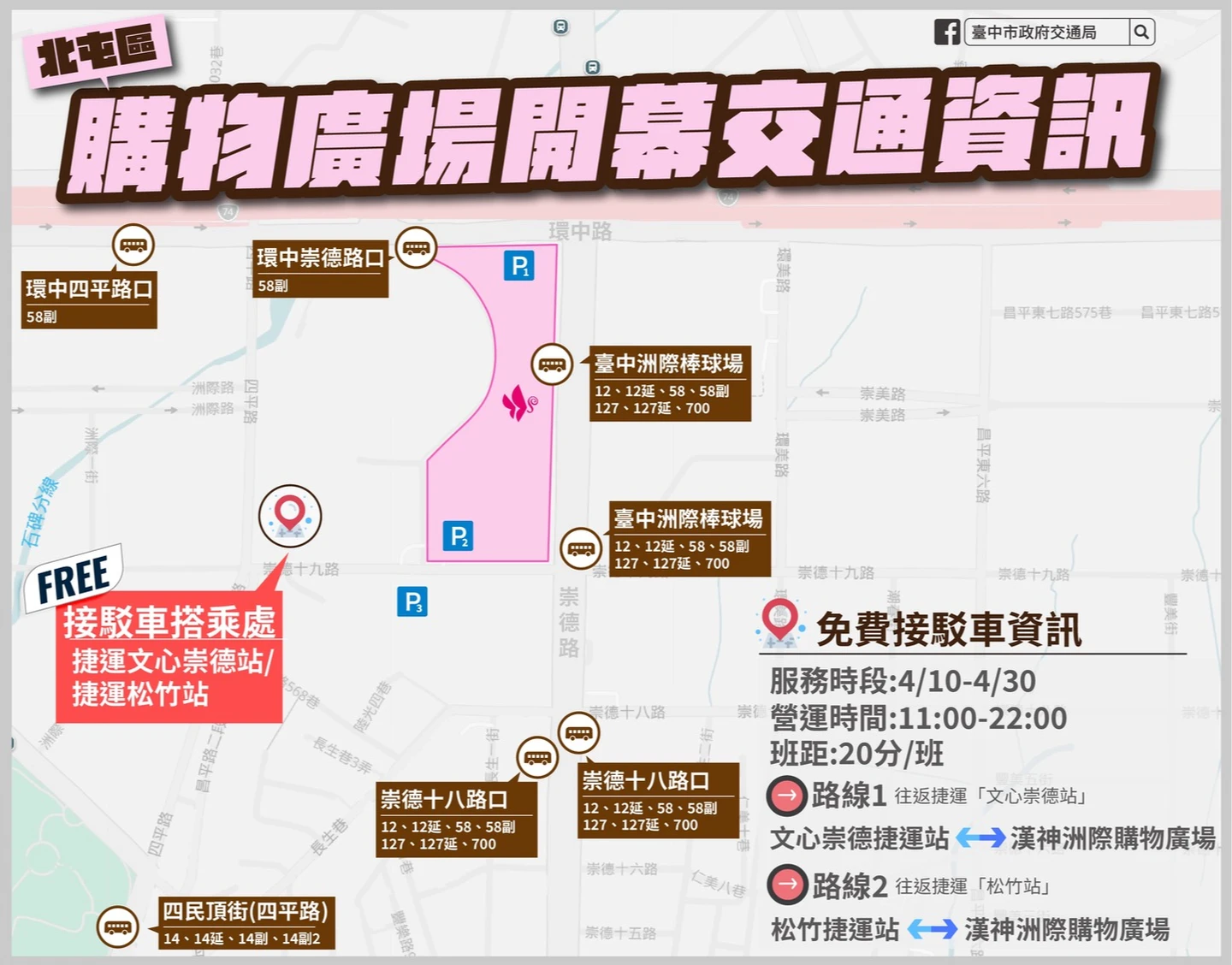 此外,因鄰近洲際棒球場,未來若遇球賽活動,商場與賽事人潮可能重疊,市府也預先擬定聯合疏運方案,強化整體交通承載能力,並將持續滾動檢討。為鼓勵民眾搭乘大眾運輸,業者亦規劃自台中捷運松竹站及文心崇德站發車的2條接駁專車路線,並推出相關優惠措施,盼降低私人車輛進場比例。