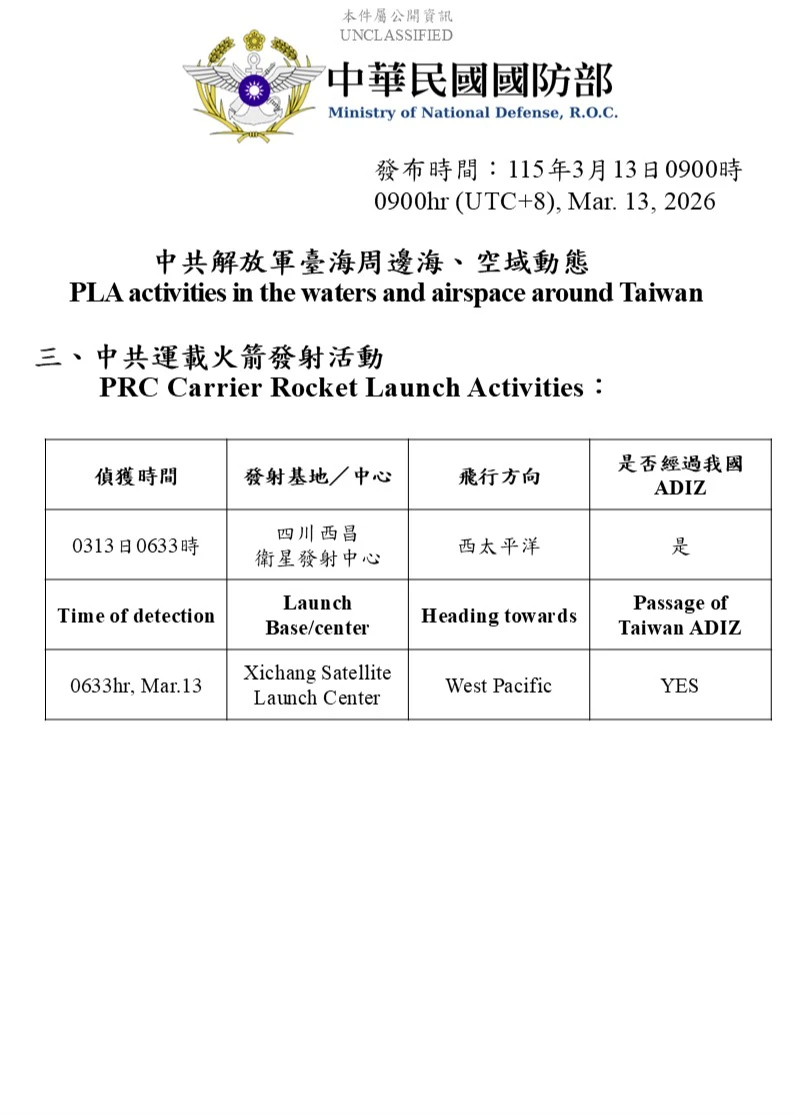 國防部今早發布中共解放軍在台海周邊動態,其中,今早0633時偵獲中共於四川西昌衛星發射中心,執行運載火箭搭載衛星發射任務。國防部說明,該火箭飛行路徑經台灣防空識別區西南部,朝西太平洋方向,高度位於大氣層外,對台灣地區無危害。國軍運用聯合情監偵系統,嚴密掌握相關動態,適切警戒與應處。