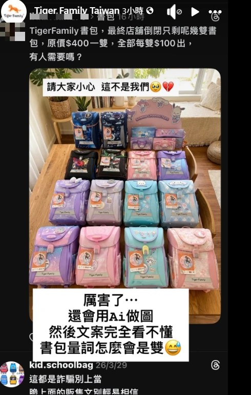 【記者盧麗蓮/綜合報導】知名品牌Tiger Family 販售的專業護脊背包相當知名,近來網路卻出現多人發文,指店面倒閉、歇業等原因結束營業,店內所有書包「1個300元」出清,引發許多家長疑惑。Tiger Family特別發文提醒,「這是詐騙!我們才沒有歇業。」