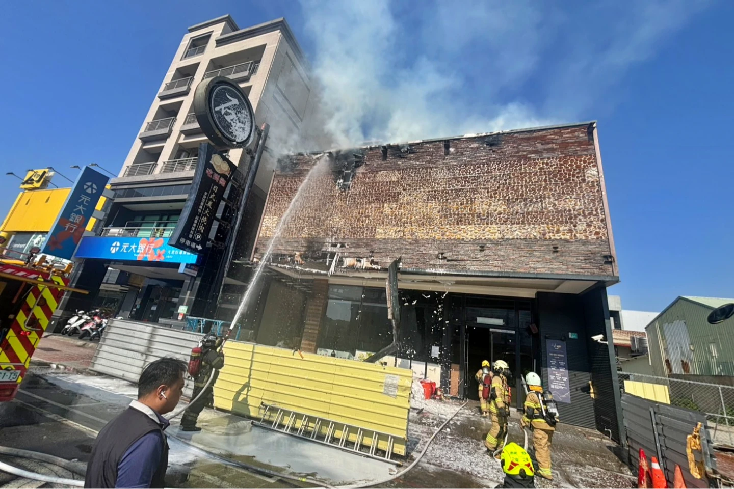 經初步了解,該處原為知名的石頭火鍋店,因租約到期暫停歇業。今天疑因工人在外部進行H型鋼焊接作業時,不慎引燃看板。確切起火原因、財物損失,仍待火調人員進一步釐清。