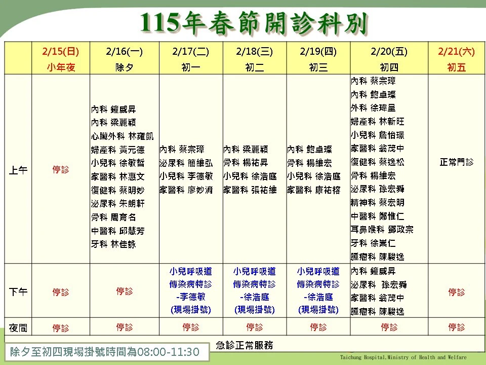 【記者王煌忠/台中報導】春節九天連假正式展開,因應民眾返鄉團聚與出遊期間的就醫需求,衛福部臺中醫院宣布,從除夕至大年初四天天開設白天門診,除內科、外科、婦產科、兒科及家醫科外,今年更首度在除夕與初四加開牙科門診,並於初一至初三設置傳染病特診,提供民眾春節期間不中斷的醫療服務。
