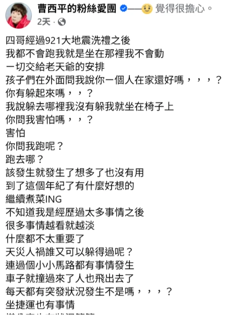 本月28日凌晨,曹西平才在其臉書粉專《曹西平的粉絲愛團》針對大地震發文。他開頭寫道,四哥經過921大地震洗禮之後,我都不會跑,我就是坐在那裡我不會動,ㄧ切交給老天爺的安排。
