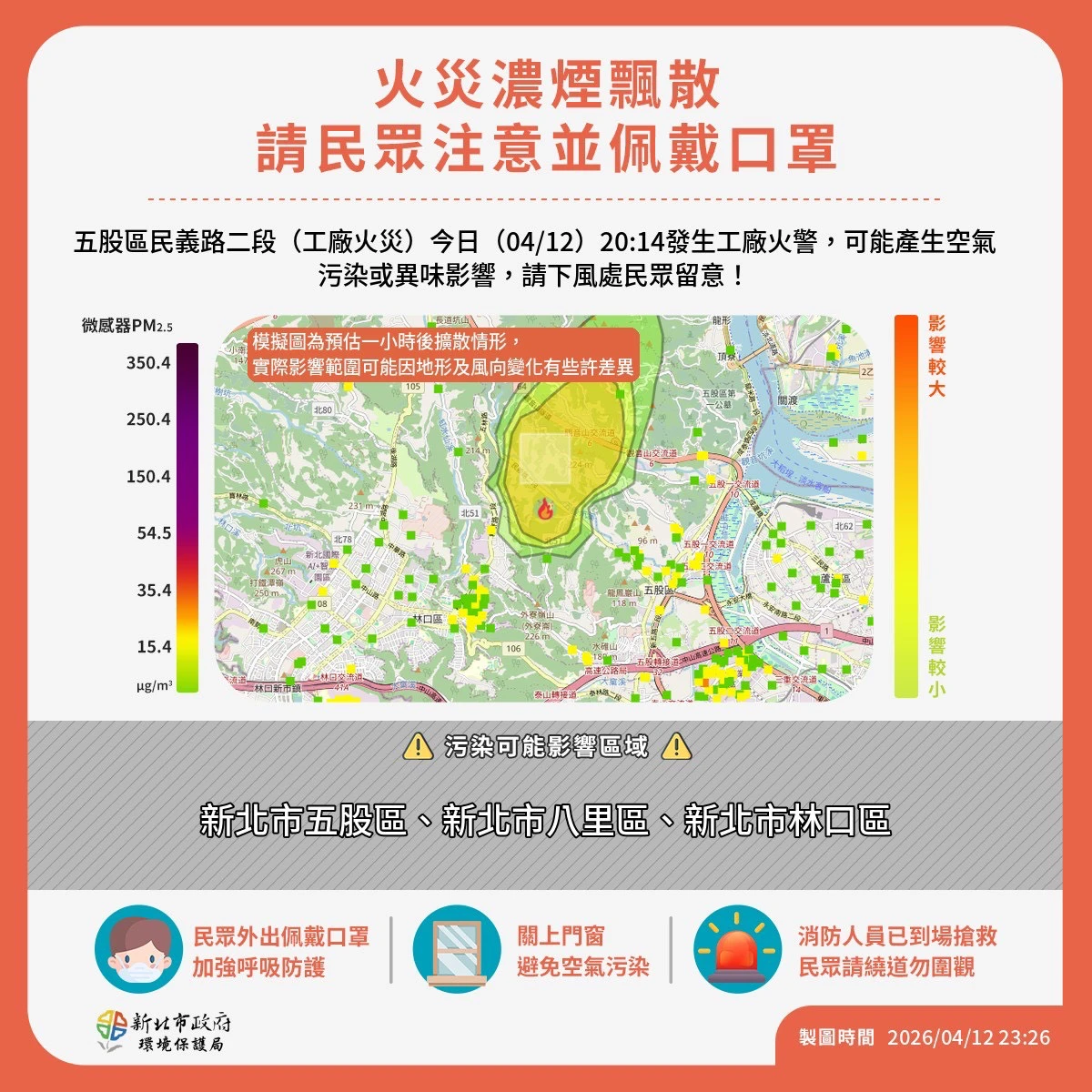 新北市環保局表示,12日晚上 8時14分,新北市五股區民義路二段工廠火災,經模式模擬煙霧及部分異味可能往下風處飄散,預估影響範圍包括新北市五股區、八里區、林口區。