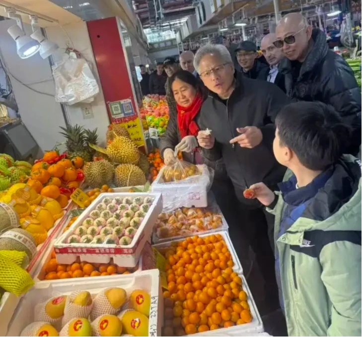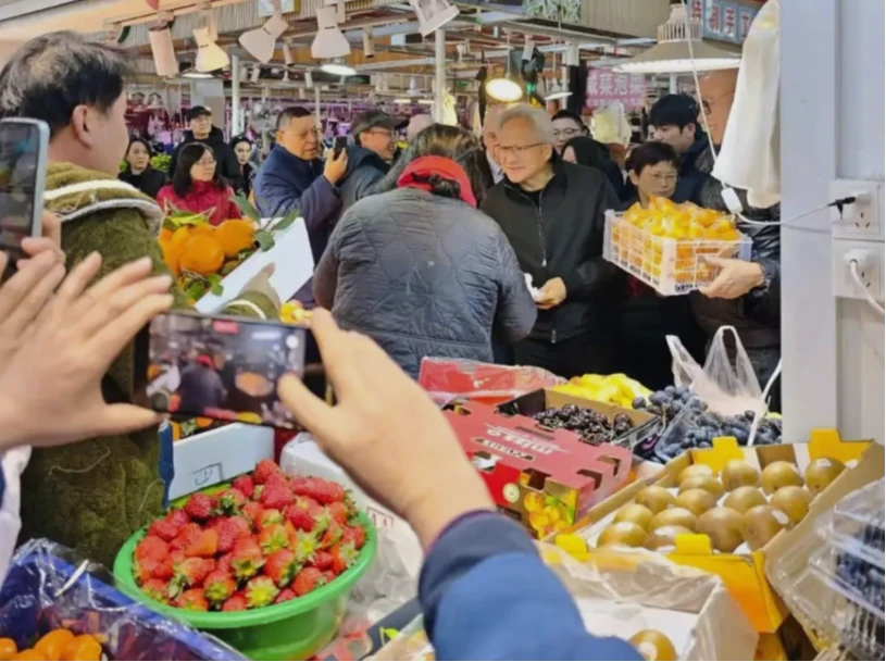 黃仁勳現身上海陸家嘴錦德菜市場買水果 與民眾合照展現親和力
