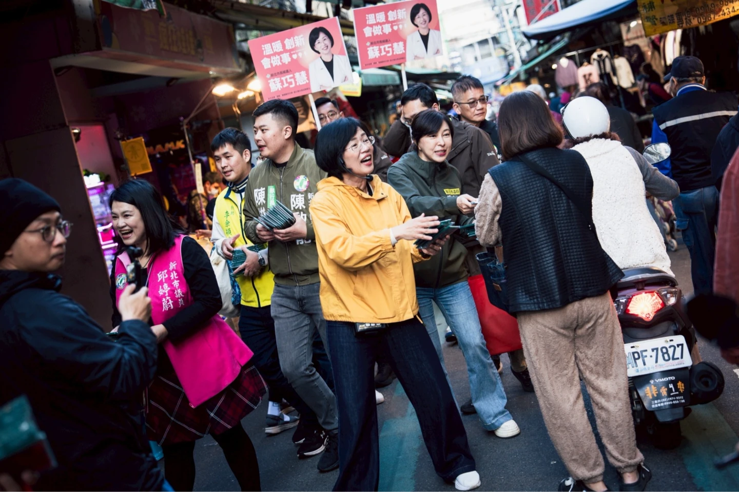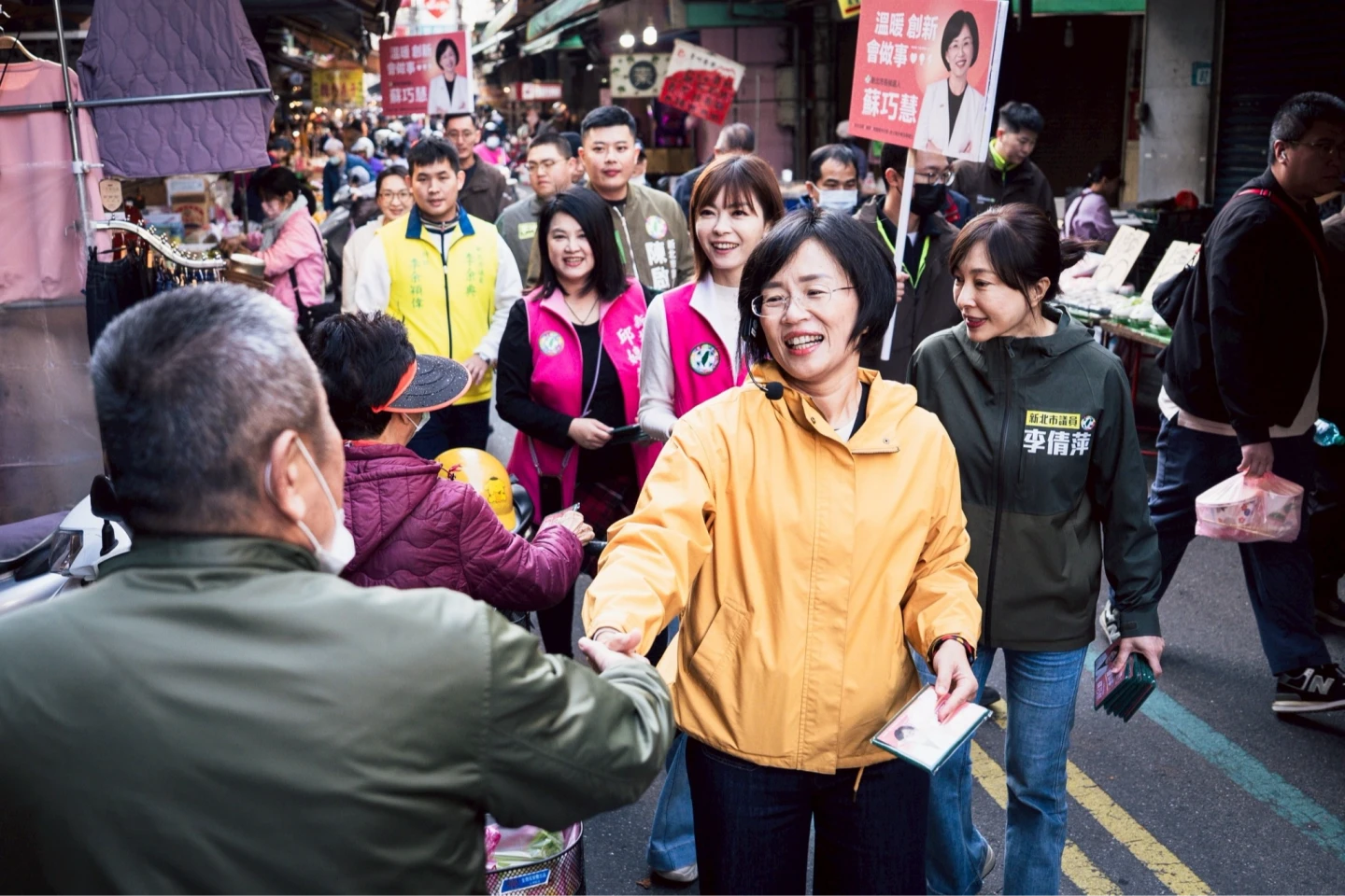 蘇巧慧今早率新北市跨黨派議員包括顏蔚慈、彭佳芸、李倩萍、邱婷蔚共同到三重重新、中央市場掃街,立委李坤城、議員李余典、議員陳啟能團隊也到場相挺,形塑派系團結氣勢。