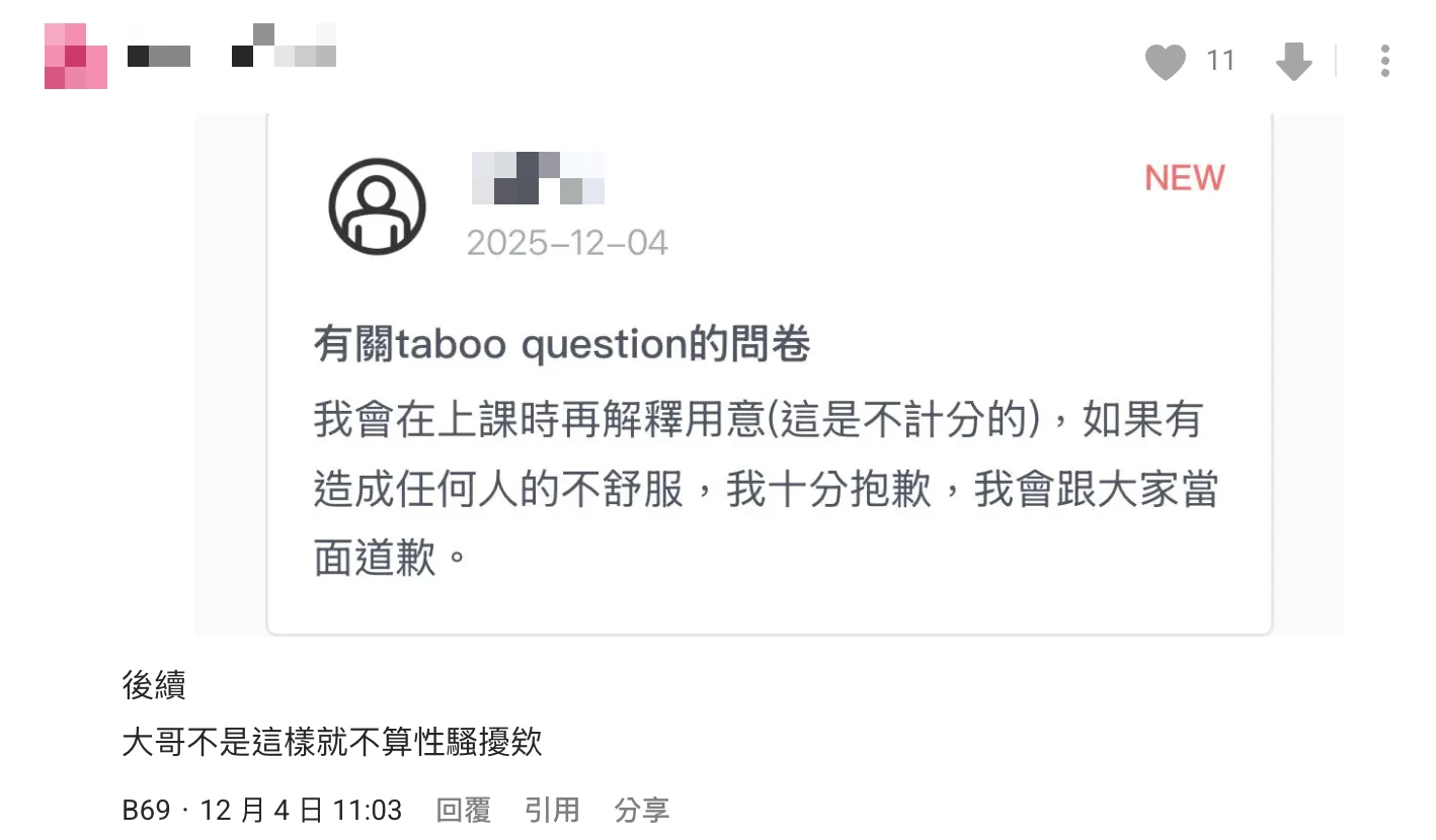 獨家|大學講師爆性騷!課堂問卷狂問「性事」還揶揄 本人道歉喊冤:想多點互動