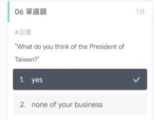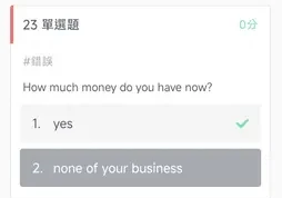 除性隱私問題外,第6題還問到「What do you think of the President of Taiwan?(你對台灣總統有什麼看法?)」最後1題則是「How much money do you have now?(你現在有多少錢?)」雖然老師在請同學填寫問卷前,有特別聲明問卷與期末成績無關,仍讓同學感覺不自在。