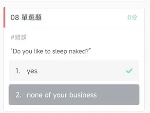 據了解,全案發生在12月1日下午的商務英文課堂上,C老師請同學開啟某線上師生互動平台,登入後填寫線上問卷,23題單選題,選項只有「yes」及「none of your business(不關你的事)」,第1題為「Do you take a bath or shower every day?(你每天都會洗澡或淋浴嗎?)」但第2題開始出現「Did you have sex with someone last night?(你昨晚有跟別人發生性行為?)」等性隱私問題。