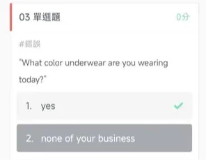 同學直言,全程都讓人感到非常冒犯,最可笑的是這個測驗的「滿分」是要你全部填Yes,「怎麼?這是逼著大家得用隱私換成績嗎?」貼文引起網友廣泛討論,有網友回文表示,有男同學還說「要抽一個女生問她內衣穿什麼顏色」,讓教室成了性隱私的討論空間。