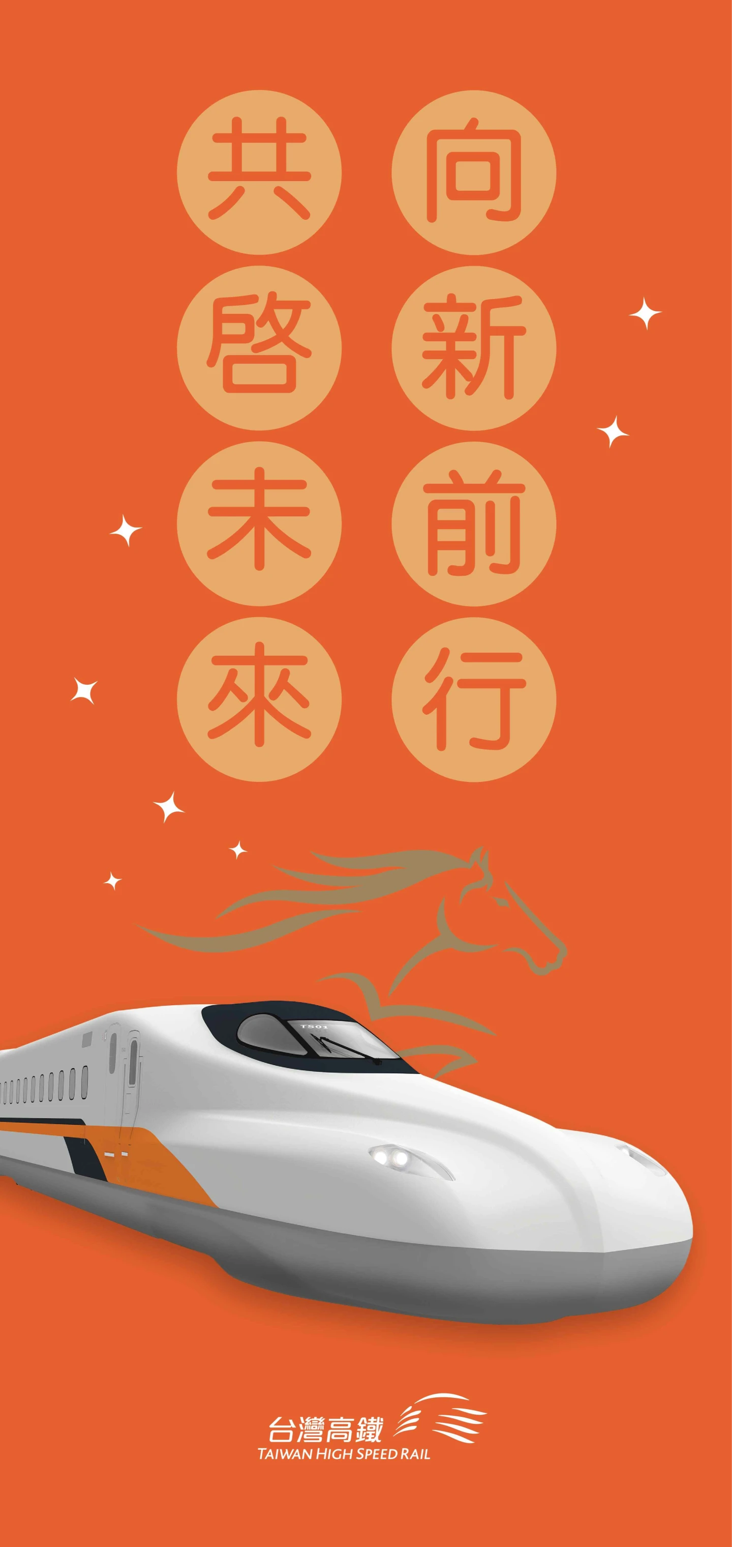 因此春聯特別以「向新前行 共啓未來」為主題,搭配N700ST列車圖像,更別出心裁地以象徵高鐵的橘色為底、搭配喜慶的金色。同時,結合馬年生肖,透過簡約線條生動展現奔馬姿態與朝氣,營造大吉大利的年節氛圍。台灣高鐵公司希望,藉著首度發送的新車春聯,展現提供旅客更加舒適、美好服務的滿滿心意。