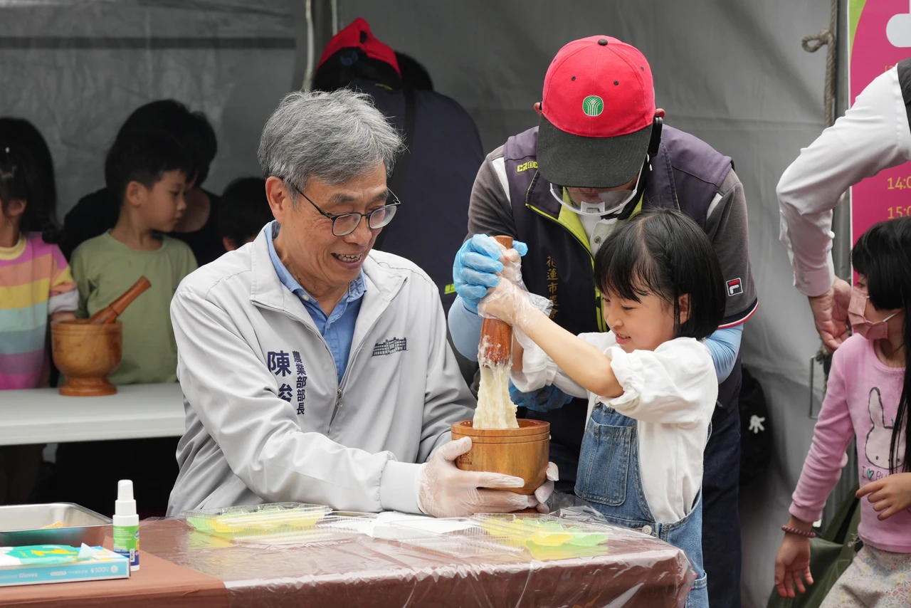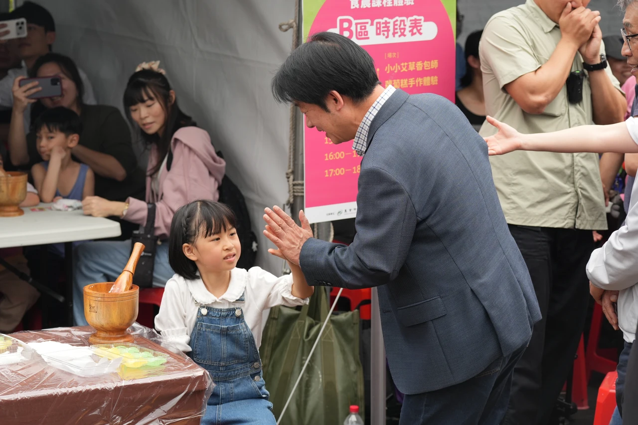 賴清德下午現身出席,在農業部長陳駿季陪同下,前往食農教育課程體驗區,與小朋友們一同親手製作麻糬;接著參觀蔬果迷宮及稻草藝術裝置,沿途與民眾及小朋友們親切互動、致意。