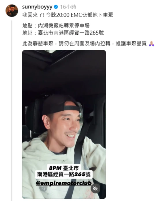 藝人王陽明昨天下午透過threads社群《sunnyboyyy Sunny Wang 王陽明》發出67字車聚文,他先以「我回來了」為開頭,內文貼出北部地下車聚晚間是昨晚8時許,地點在內湖機廠站轉乘停車場,約車友車聚,文中還提醒參加車聚的車友「此為靜態車聚,請勿在周圍及場內拉轉,維護車聚品質」。