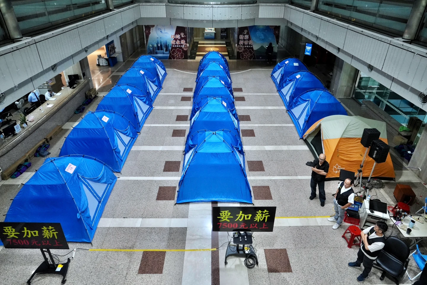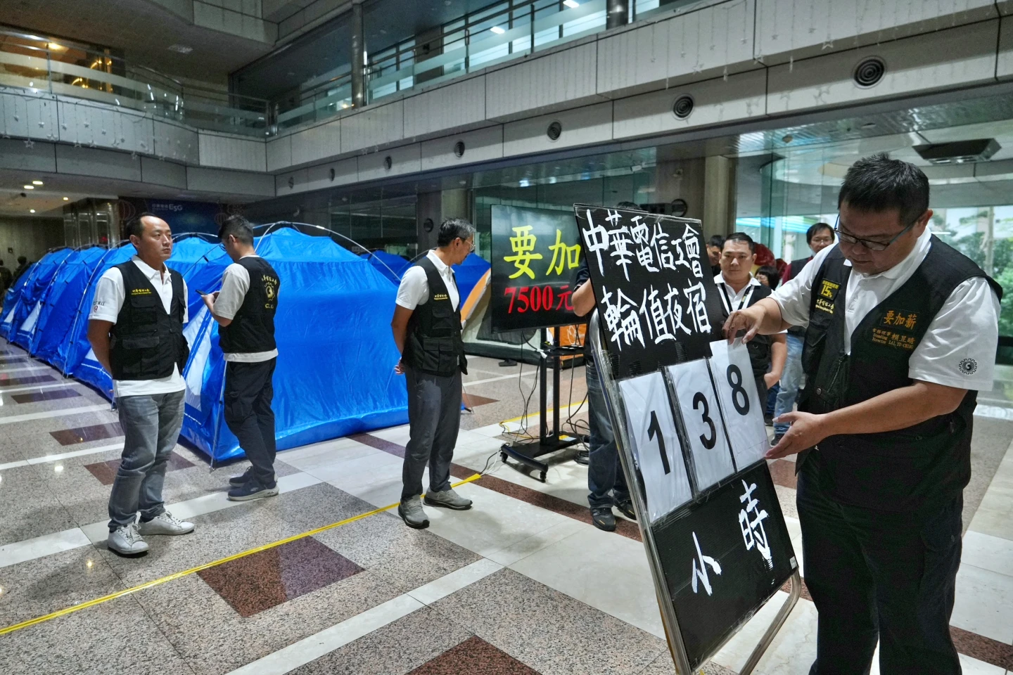 中華電信總公司大樓大廳架設14頂帳篷,工會數十人今聚集大廳前齊聲喊話「加薪7500、交通津貼提高至5000、勞退新制提撥15%、取消強制退休年齡」,賴昱晴表示,工會10/28跟公司開團體協商修正會議,公司對於工會的態度一直漠不關心,且只要是工會提出的團體協會訴求或是主要4項訴求,公司一概不跟我們取得聯繫,28日當天跟公司協商破裂後,當晚開始留宿公司抗議;這期間公司有派員下來,溝通過程都沒有任何的善意回應,且下來都不到5分鐘就離開,這次最主要針對這四個訴求外,還有團體協約。