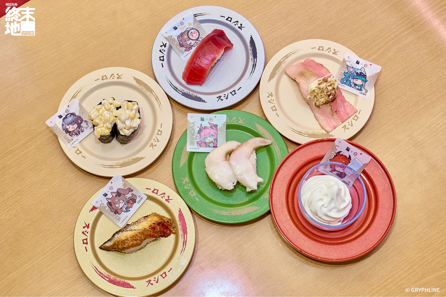 台灣壽司郎即日起至3月20日攜手遊戲《明日方舟:終末地》推出期間限定聯名活動,以「壽司集成計畫」為主題,凡至全台壽司郎內用點購指定餐點「鮪魚極上赤身」、「極上鰻魚」、「烏貝」、「炙燒起司培根」、「玉米沙拉軍艦」、「北海道牛奶霜淇淋」,隨餐附贈Q版立繪插卡乙張(款式隨機);全套共6款角色設計,包含「伊馮」、「艾爾黛拉」、「別禮」、「萊萬汀」與「潔爾佩塔」以及全新角色「湯湯」,全台限量200,000張。