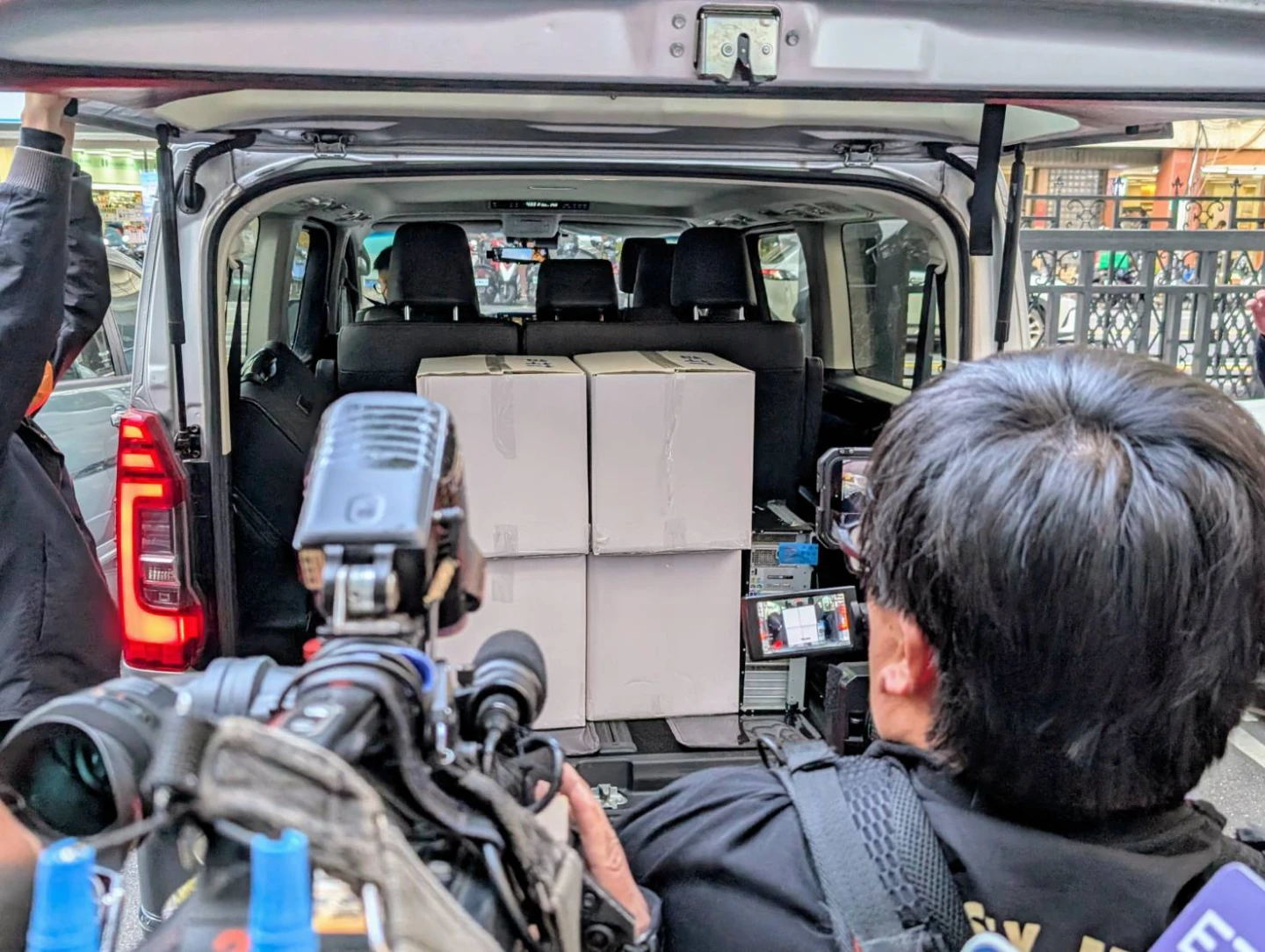 北檢主任檢察官曾揚嶺今早帶隊搜索高金素梅位於立院青島二館的辦公室,一行人上午9點半進入,一路搜索到下午4點40分許,檢調人員共帶走高金素梅的桌機,及裝載相關資料證物的7大扣押箱、2小型行李箱,搜索任務長達7小時。