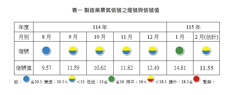 台經院今天公布,2月製造業景氣信號值減少3.26分至11.55分,燈號降回代表景氣低迷的黃藍燈。
