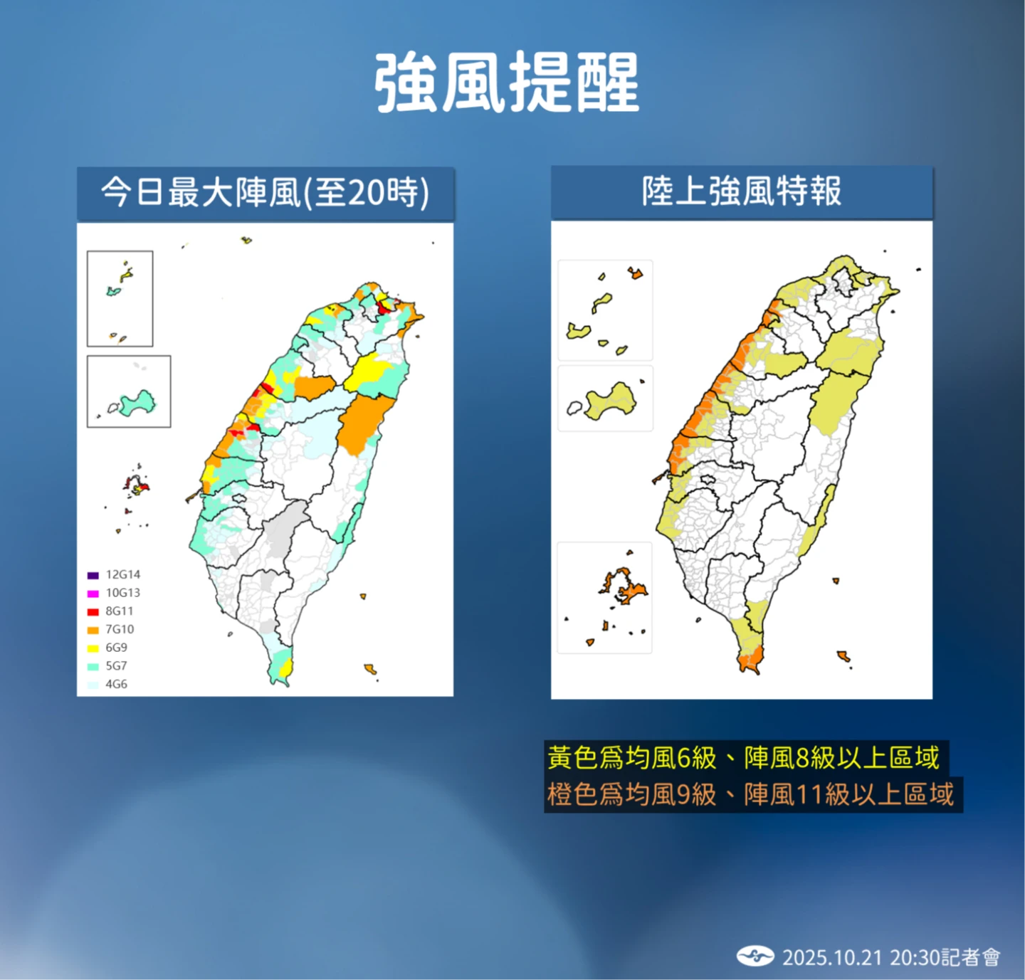 風力方面,葉致均表示,今天雲林以北風力都很明顯,外島澎湖、馬祖都有9到10級強陣風,苗栗、台中、彰化更有11級以上強陣風。