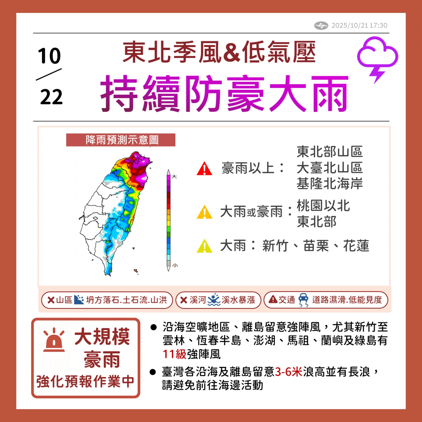 整體而言,葉致均強調,明天受低氣壓跟東北季風影響,北部、宜花會有豪大雨,尤其基隆北海岸跟大台北、宜蘭山區,會有局部豪雨,另外,各沿海跟離島會有8到11級強陣風,連台南以北內陸跟大台北,也有7到8級強陣風。