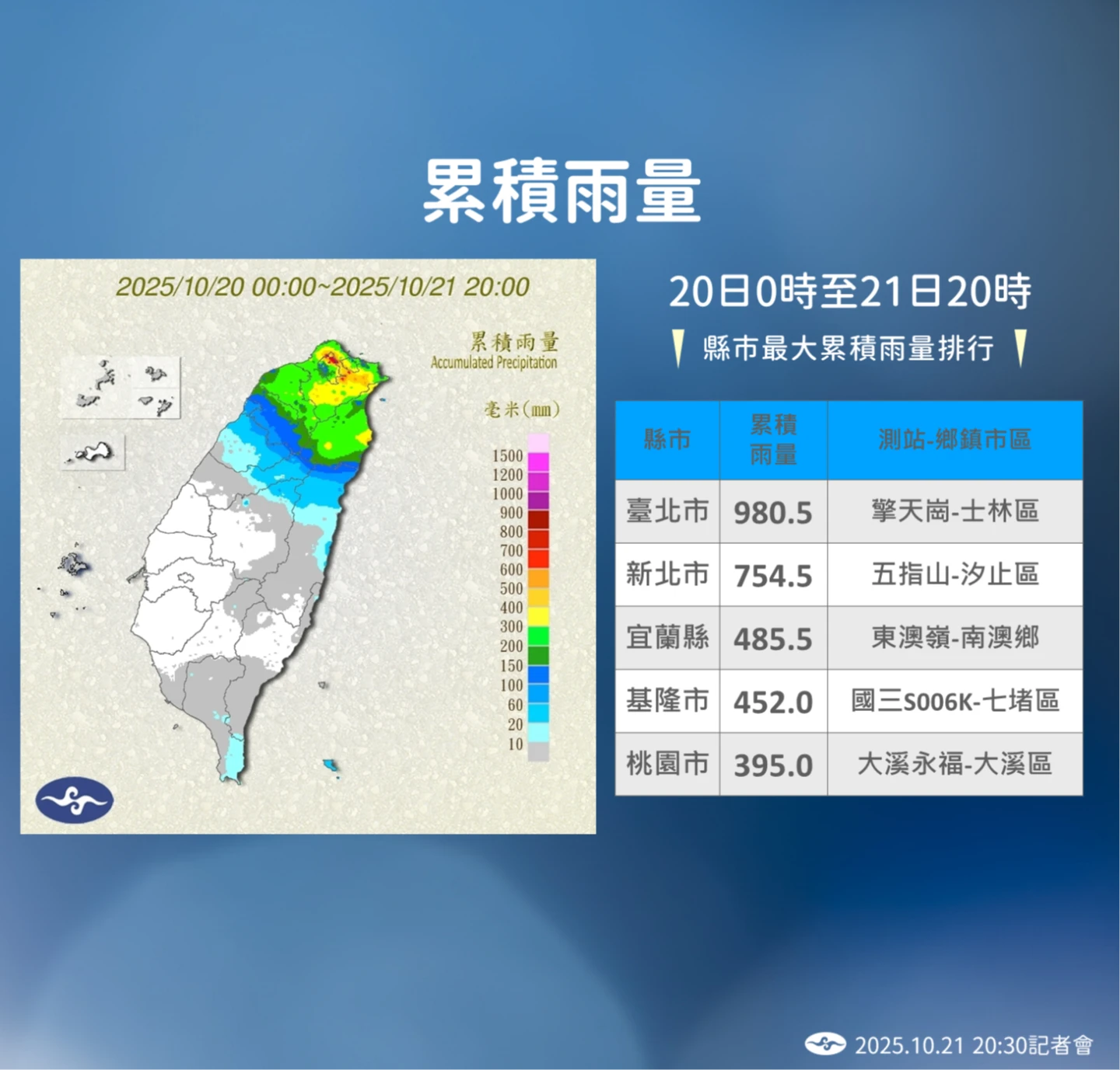 針對今天的降雨情形,葉致均指出,從昨天到今晚8時,主要降雨區域是桃園以北跟宜蘭,尤其基隆北海岸跟台北山區降雨最明顯,降雨最多的地方是台北市擎天岡,累積雨量接近1000毫米。