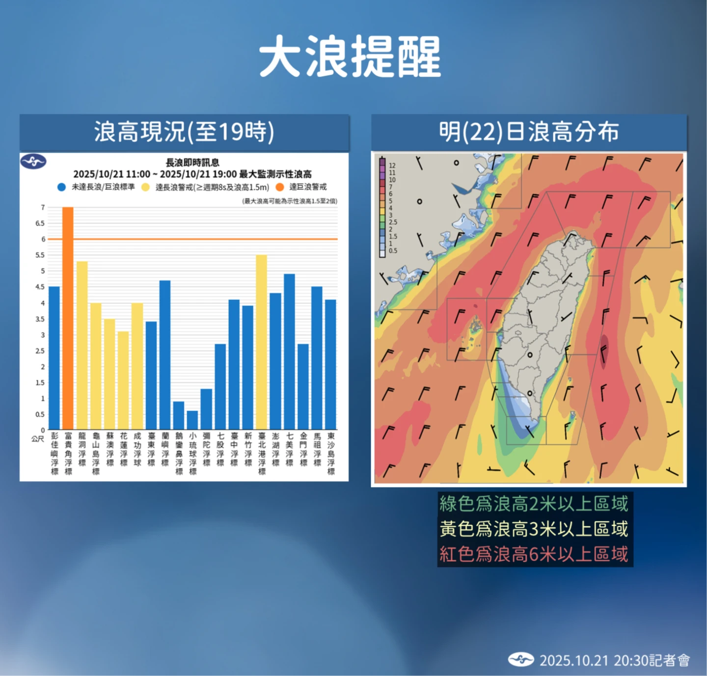 浪高部分,葉致均表示,目前各沿海都有3米以上浪高,基隆北海岸有6米以上浪高,且基隆北海岸、東部沿海都有長浪,預估明天各地都有3米以上浪高,東部跟台中以北沿海,則會有6米以上浪高出現,海象非常不好,呼籲不要前往海邊活動。
