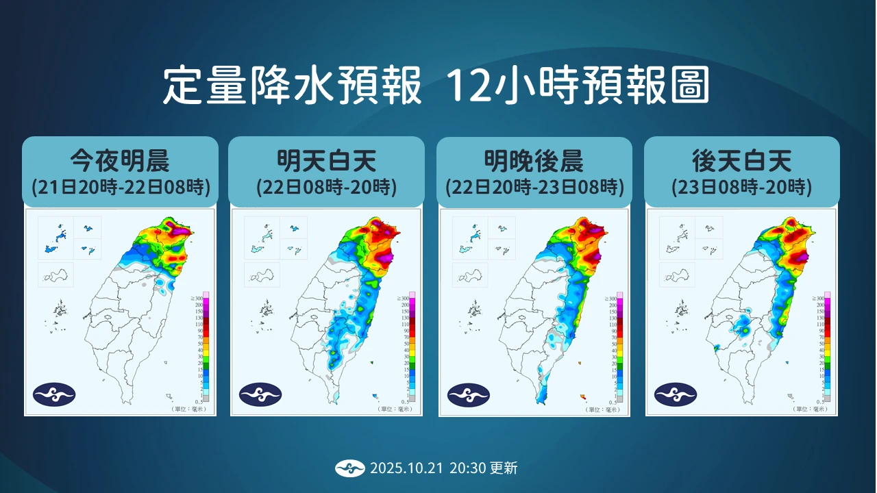 【記者王良博/台北報導】受到東北季風及低壓帶影響,今(21)日北部、東北部雨勢明顯。氣象署表示,今天新竹以北跟宜蘭降雨明顯,台北市有超過500毫米雨量,擎天岡兩天以來累積雨量接近1000毫米,明(22)日桃園以北、宜蘭降雨還是很明顯,且因低壓往南移動,明天白天起,花蓮降雨逐漸增加。
